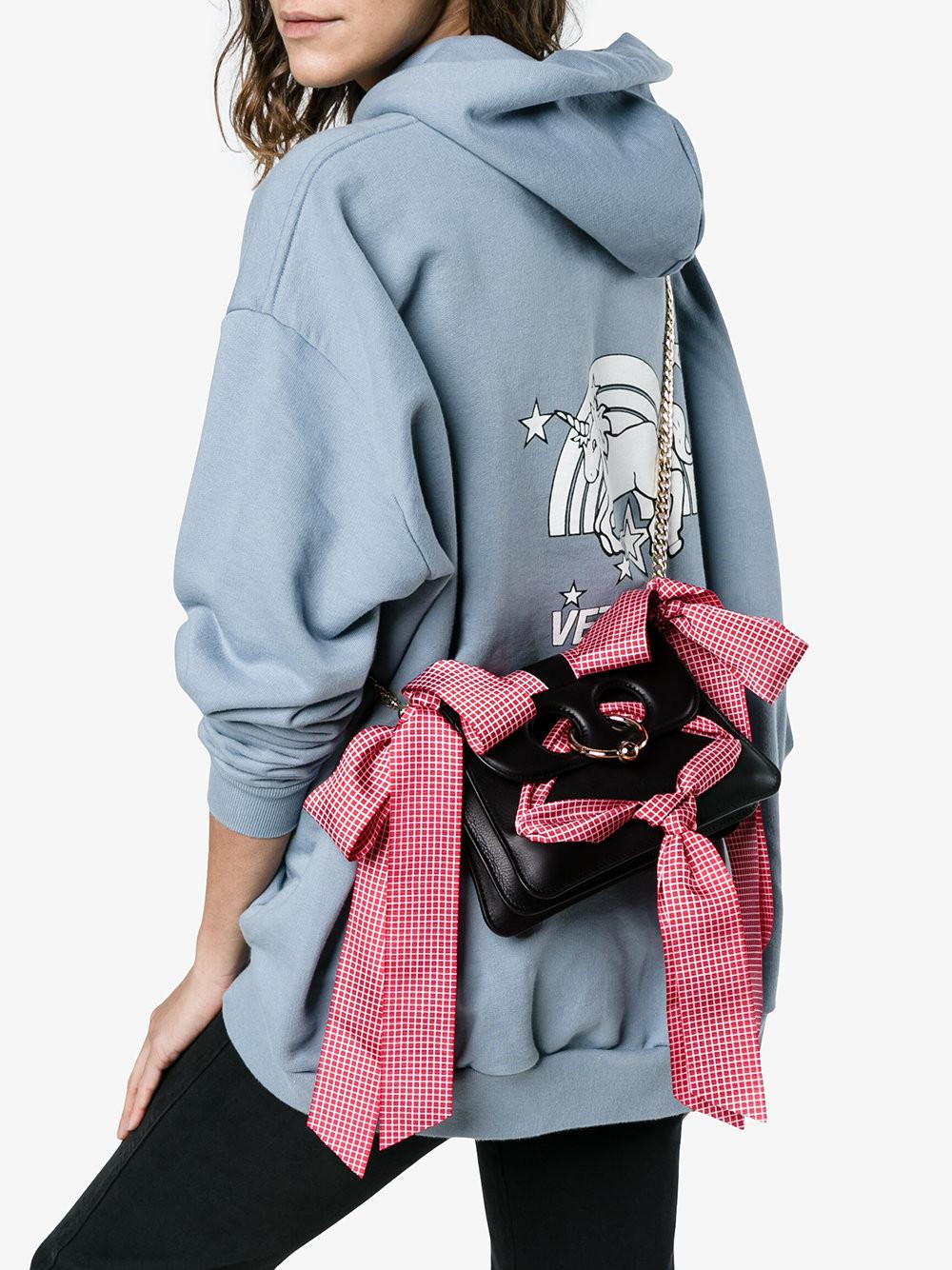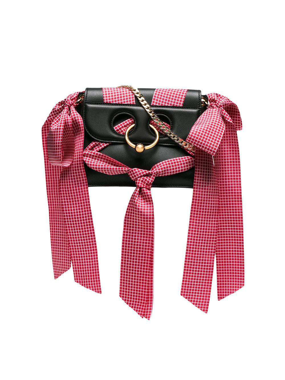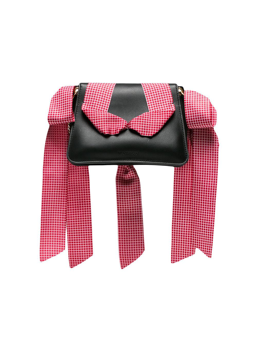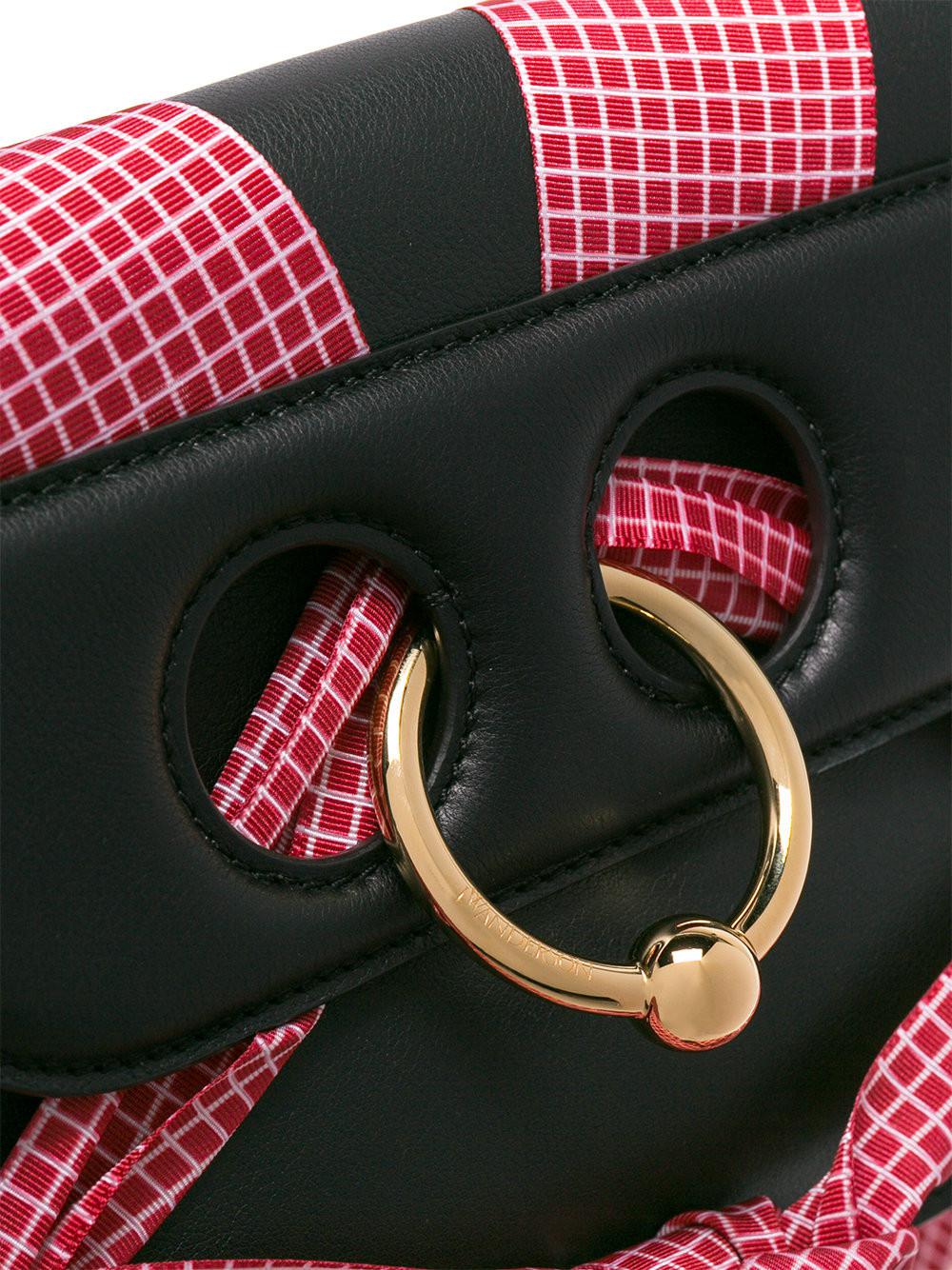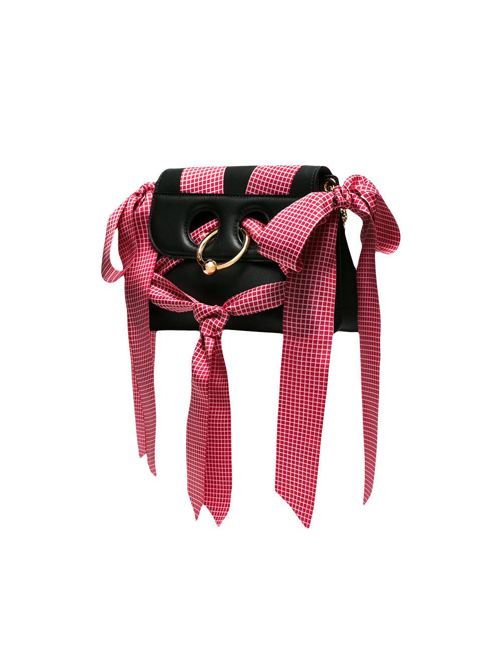 Black Leather and Cotton blend Mini Pierce Ribbon Cross Body Bag from Jw Anderson. Width: 21cm, height: 15cm, depth: 8cm, strap: 47cm. 100% leather, 100% polyamide.