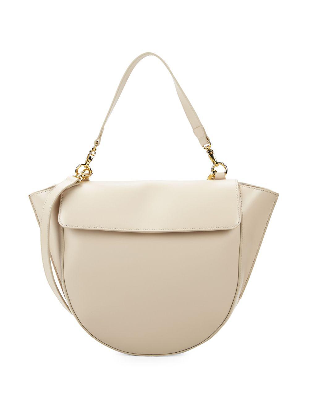 Go to Saks OFF 5THUnique curved handbag designed with detachable crossbody and shoulder straps. Foldover magnetic flap closure. Inside zip pocket. Textile lining. Italian leather. SIZE. Removable crossbody strap, 15.5" drop. Removable shoulder strap, 7" drop. 16" L x 11" W x 3.5" D. Colour: natural