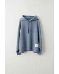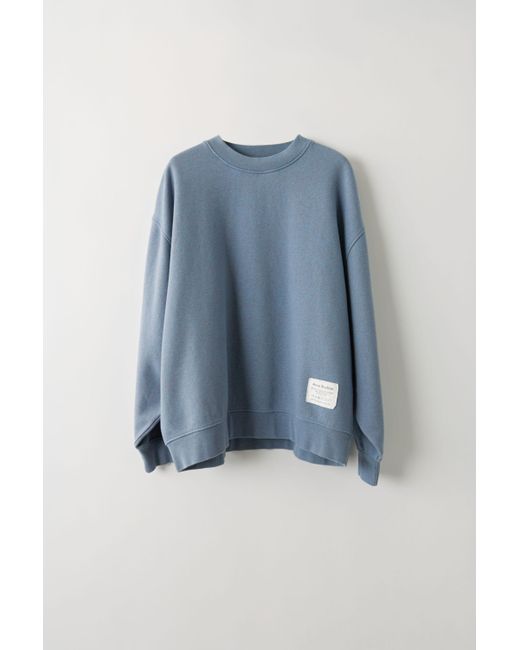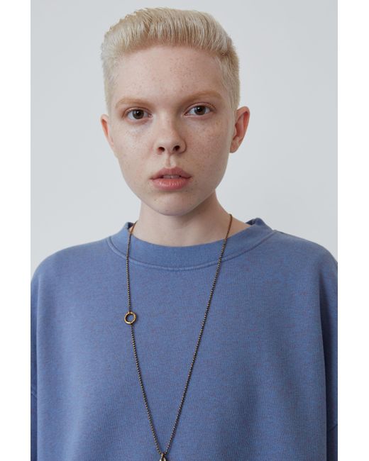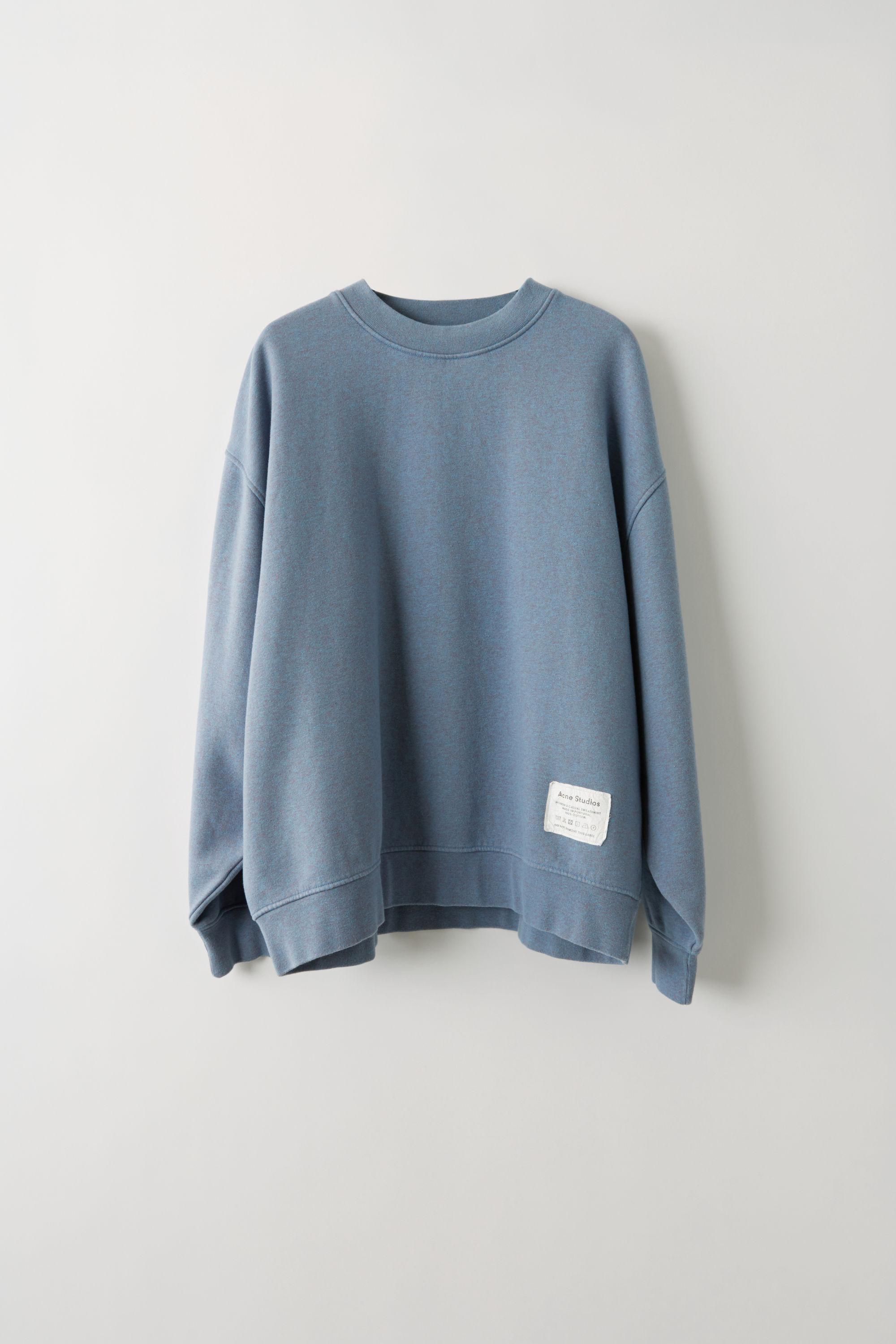 Acne Studios blue melange loose-fitting crewneck sweatshirt with a fabric care label patch at the lower side. Ribbed crewneck, cuffs, and hem. Offset shoulder seams. Fabric care label patch at lower side. Shell: 100% Cotton. Colour: blue