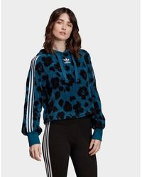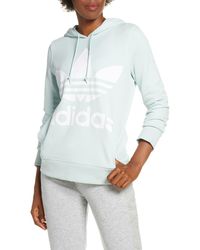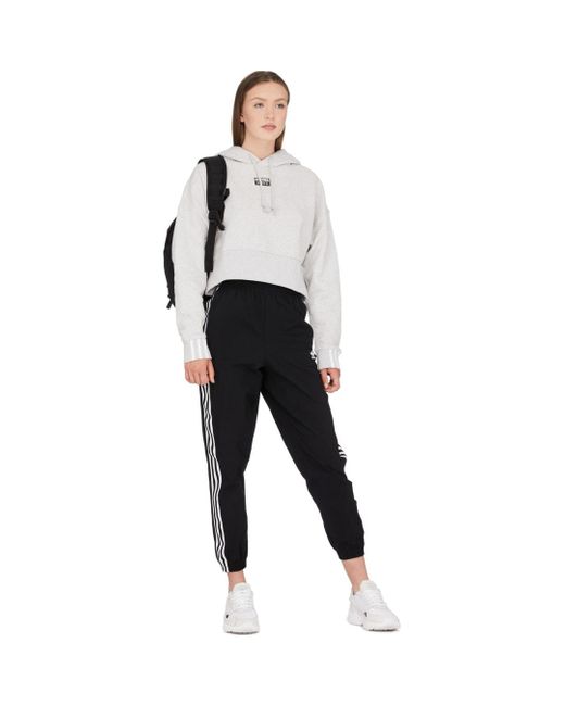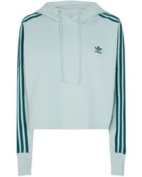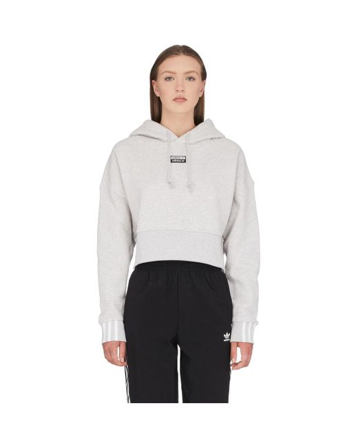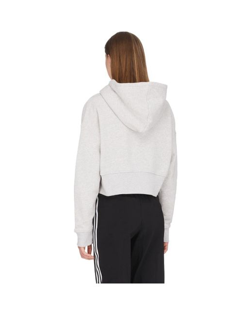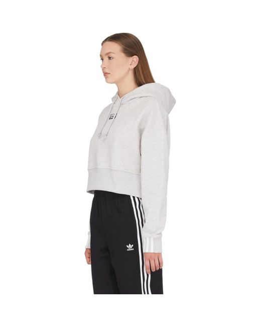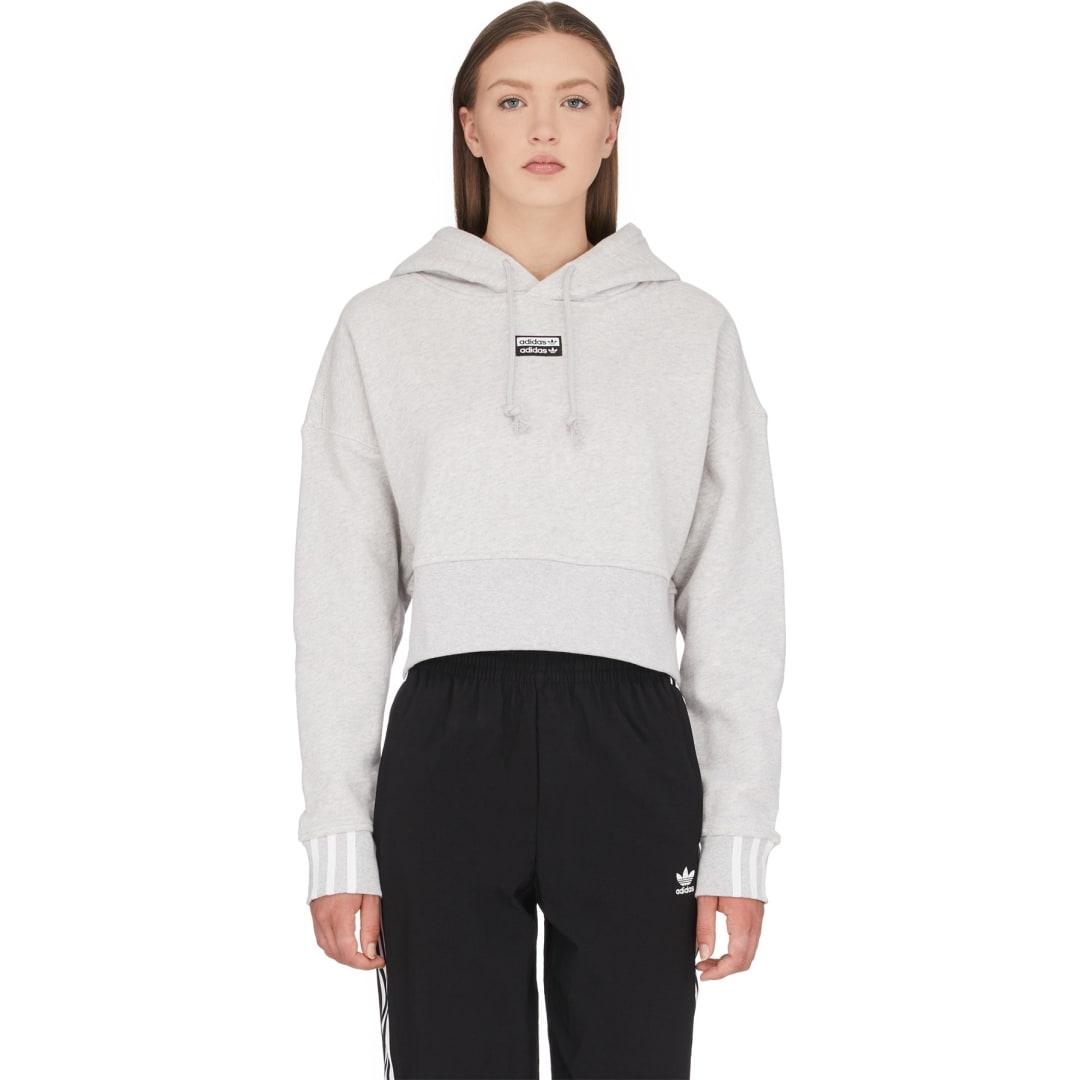 Light grey heather bold modern retro 90's inspired long sleeve plush cotton French terry cropped vocal logo hooded pullover sweater. Adjustable drawstring hood. High neckline. Drop shoulder. Ribbed hem and cuffs. White woven 3-Stripes branding tape on sleeve cuffs. Black and white 'adidas' trefoil woven double linear applique logo with black embroidered trim on front. Tonal stitching. Relaxed fit. Colour: grey