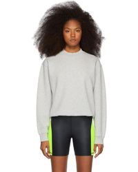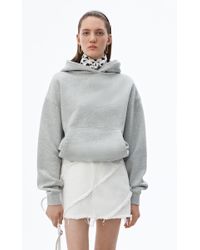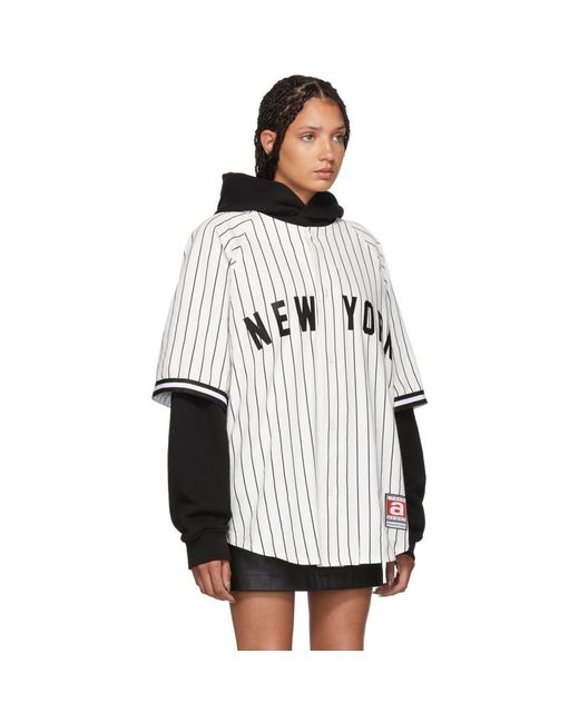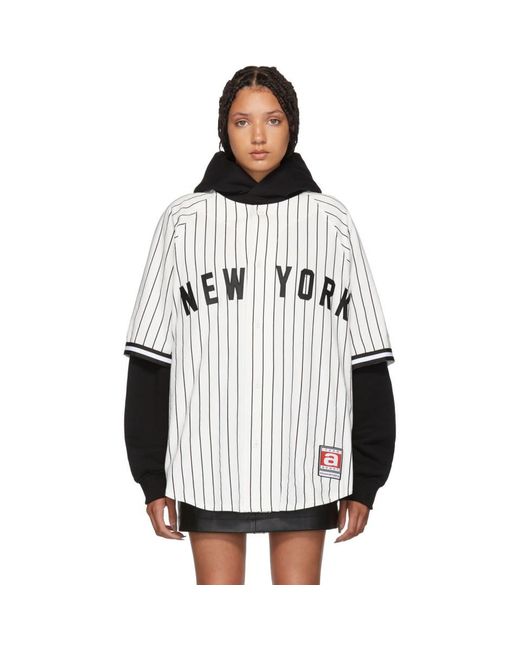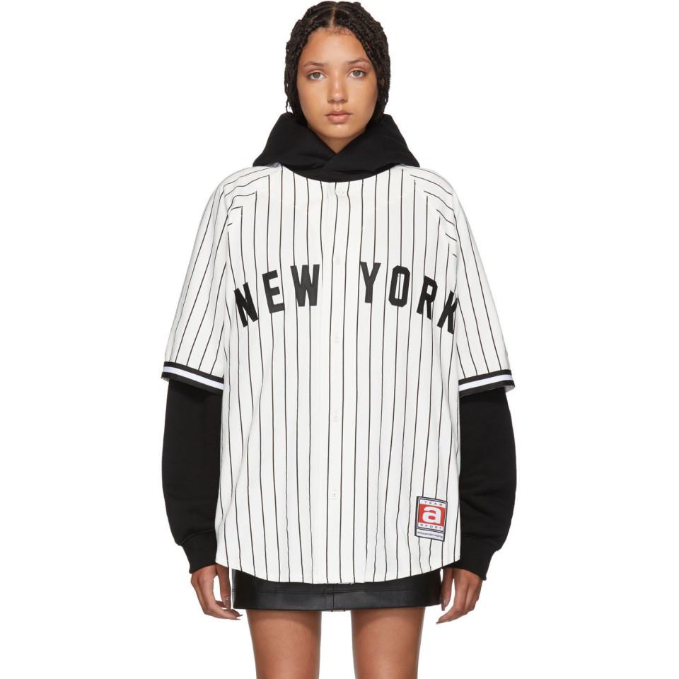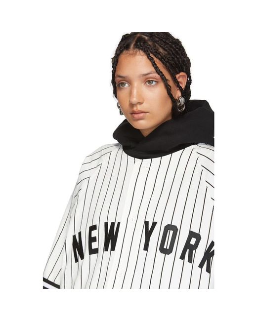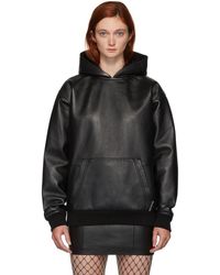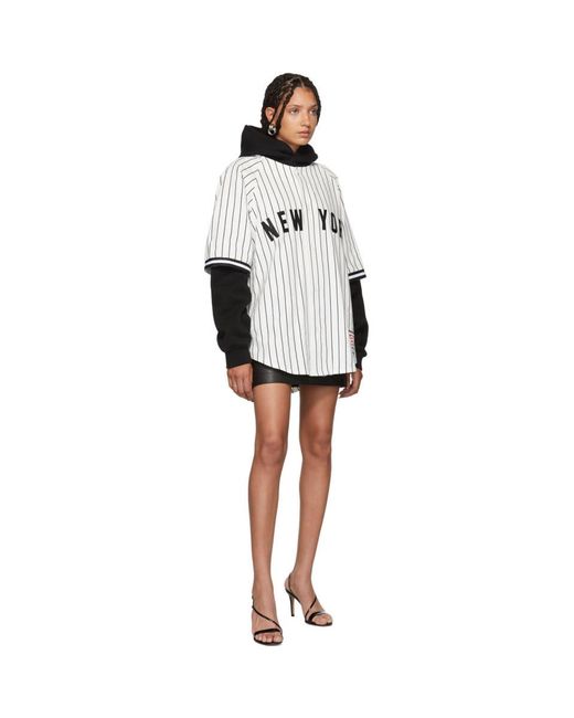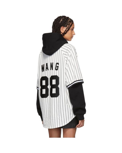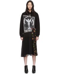 Long sleeve French terry hoodie in black. Overlay white t-shirt featuring black stripes. Button closure at front. Textile text appliques in black at chest. Concealed kangaroo pocket at waist. Textile logo appliques at hem, upper sleeve, and back. Rib knit cuffs and hem. Colour: black