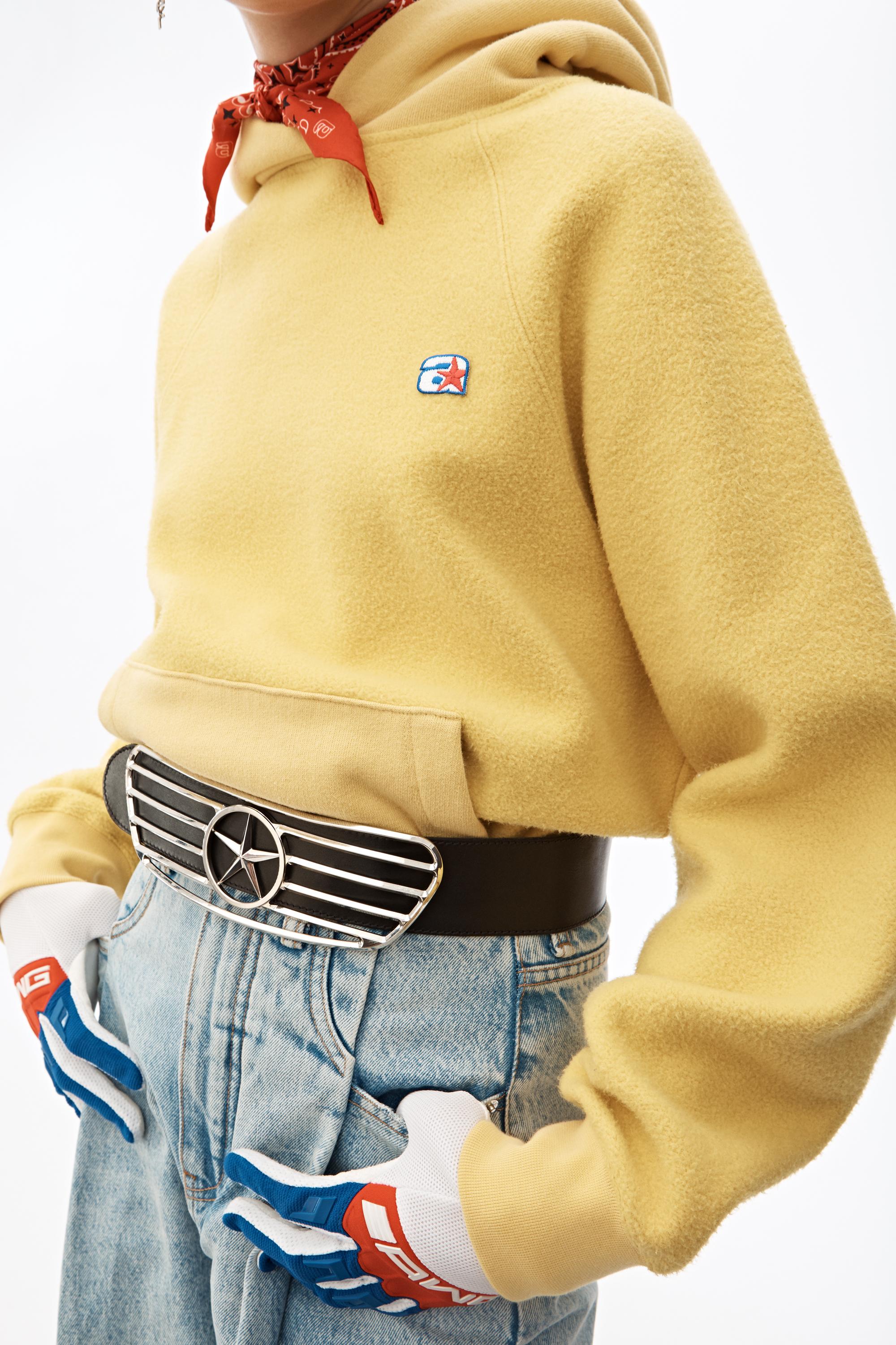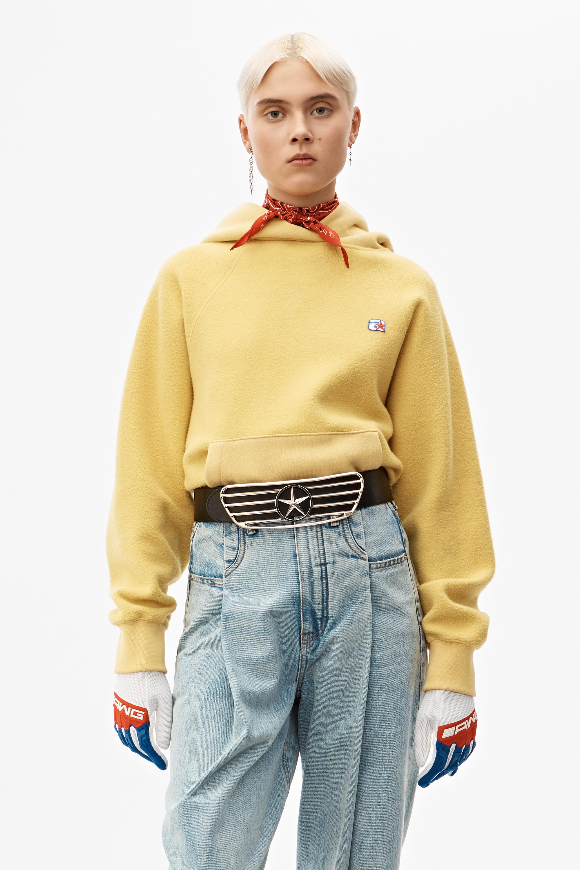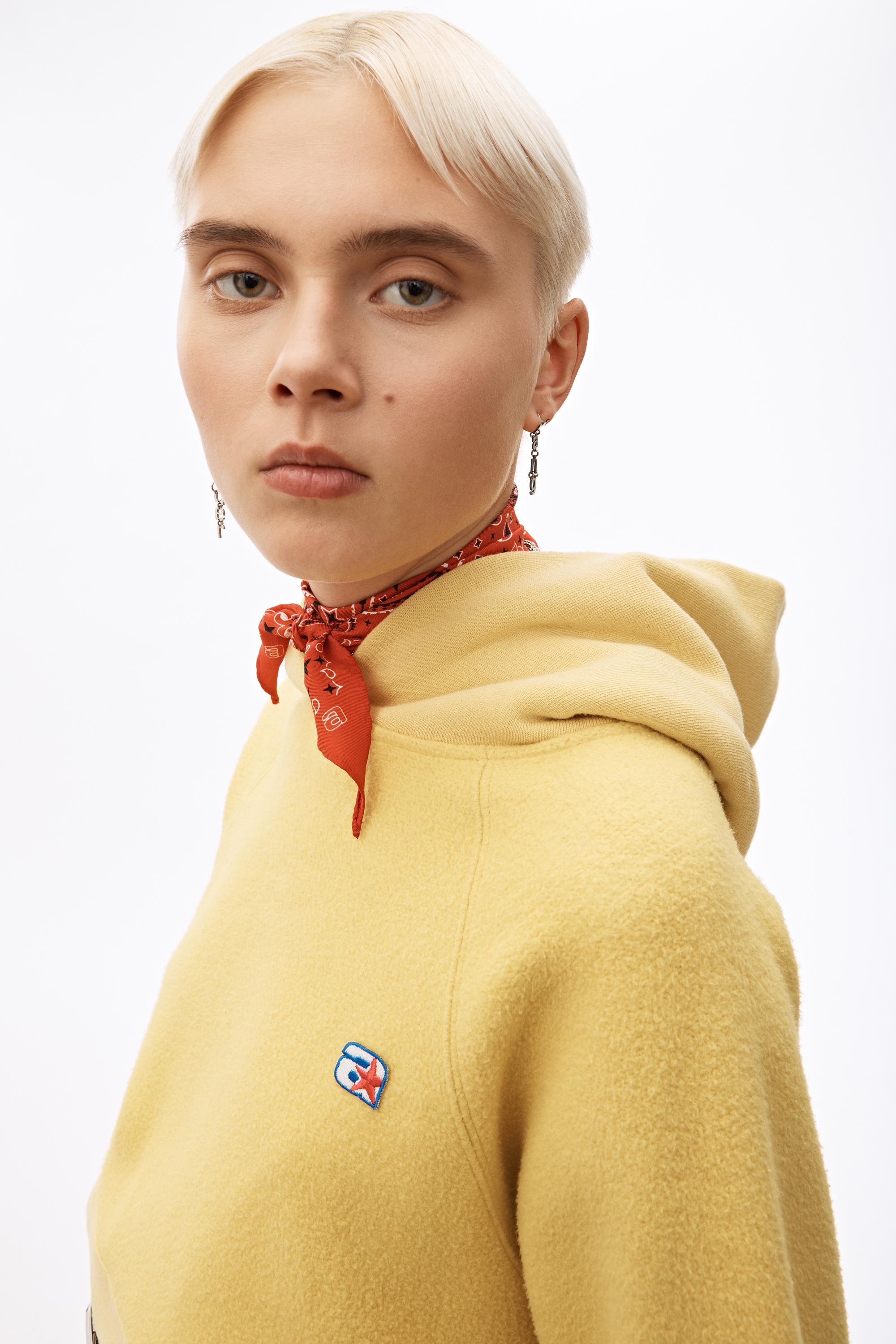 Go to Alexander WangHeavy inside-out brushed terry hoodie with seasonal logo patch at chest. Kangaroo pocket. Ribbed cuffs & hem. Relaxed fit. Hits at hip. Model is 5'10 and wears size S. 100% Cotton. Good things come to those who Wang. Machine wash cold with like colours, gentle cycle. Do not bleach. Lay flat to dry. Cool iron if needed. Colour: yellow