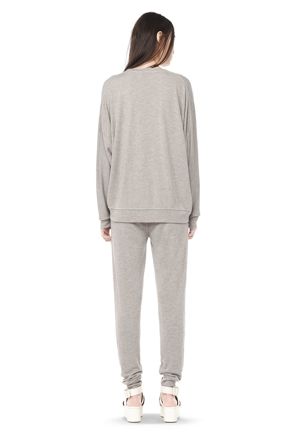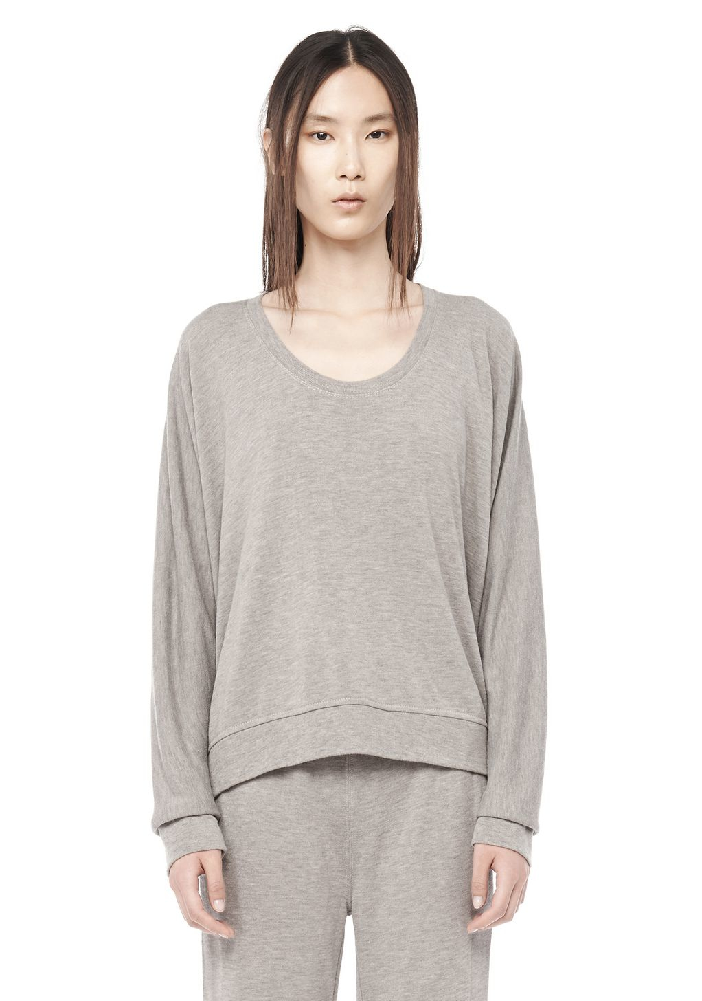 Go to Alexander WangLightweight washed french terry long sleeve crewneck top with tonal rib details and circular hem. Hits above the high hit at the front and below high hip at the back. 51% polyester 49% rayon. This item runs true to size with a relaxed fit. Measures: 25" (63.5 cm) long. Dry clean only. Colour: grey