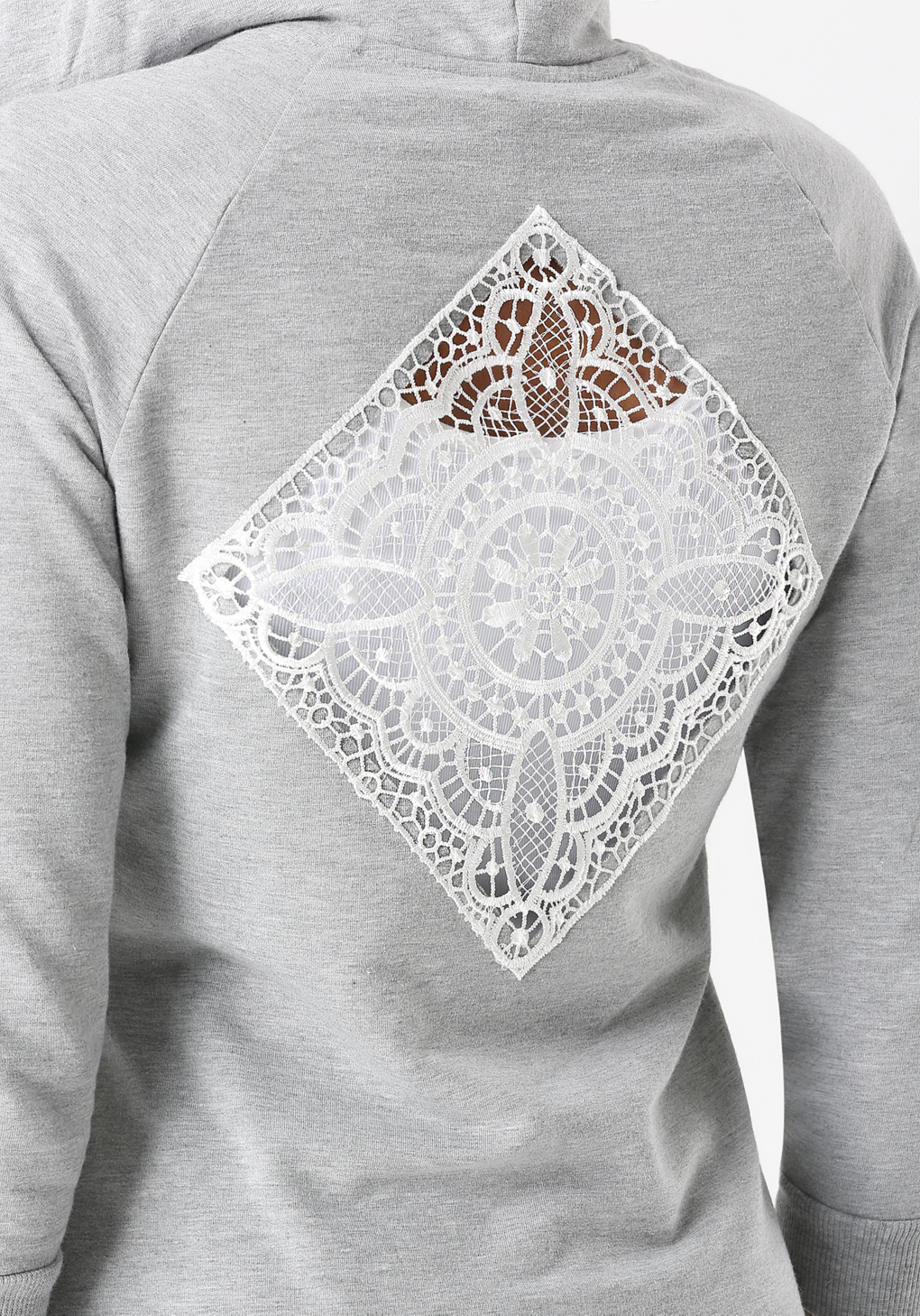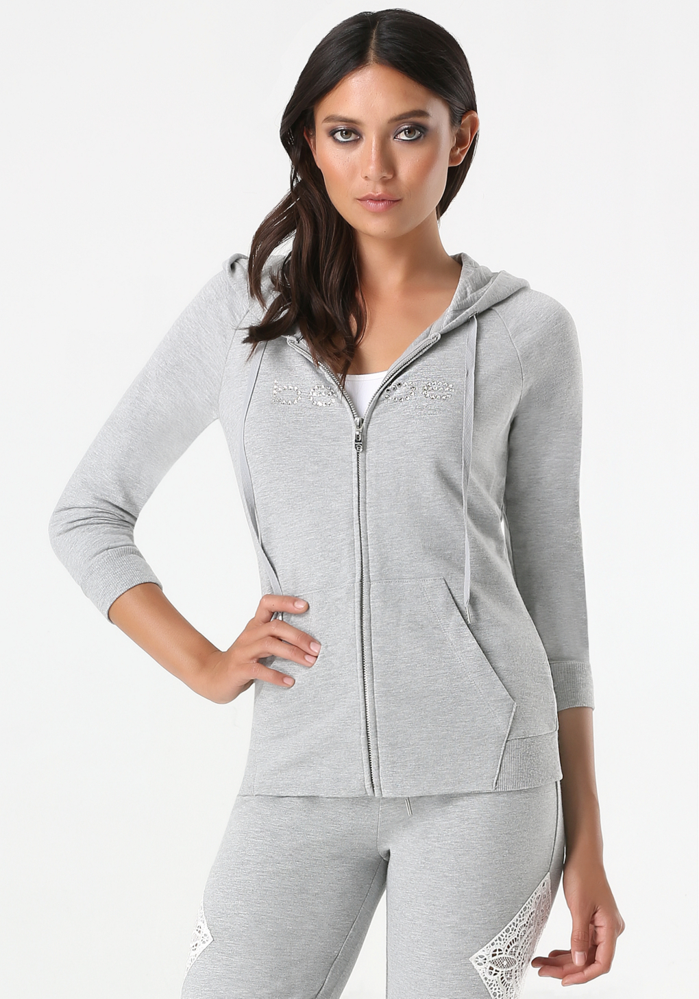 Go to BebeFlirty hoodie in a sleek 3/4 sleeve design detailed with a back crochet inset that shows off a little skin. Soft French terry interior keeps the look super comfy. Front double pockets. Front zip closure. Glittering front bebe logo. 57% Rayon, 38% cotton, 5% spandex. Machine wash. Centre back to hem: 23" (58.5 cm). Colour: grey