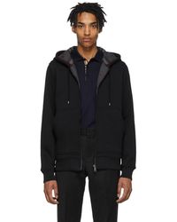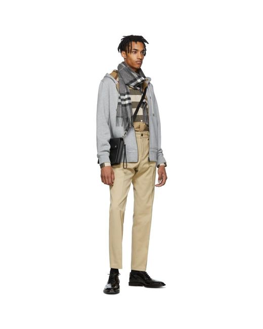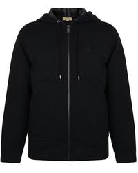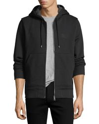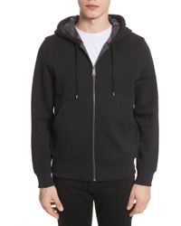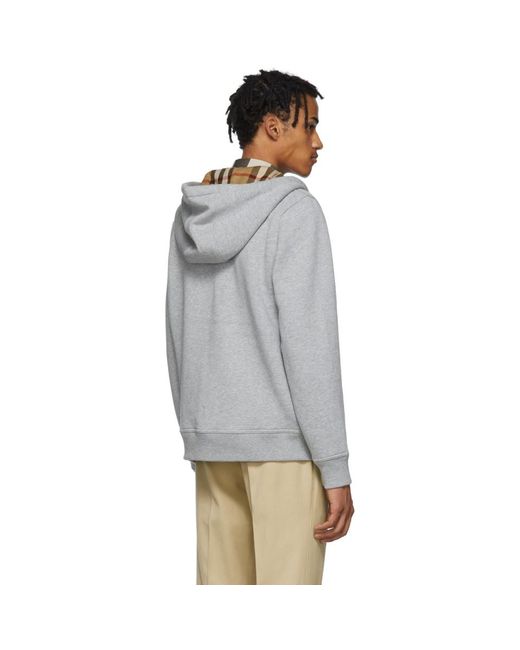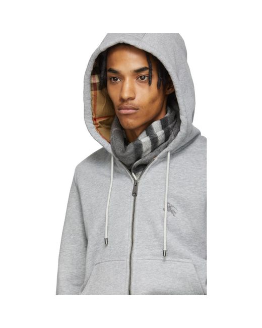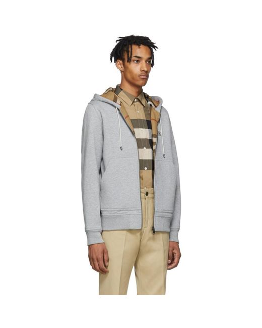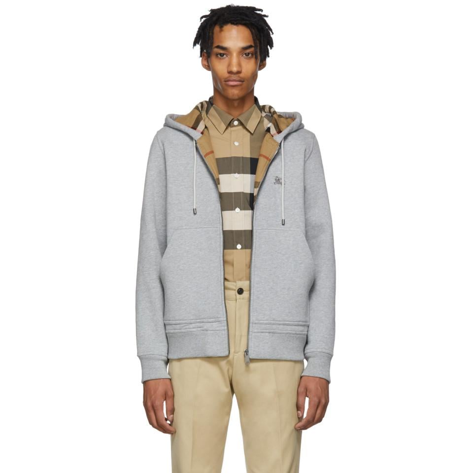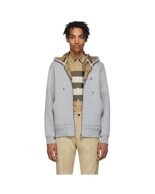 Long sleeve cotton jersey hoodie in grey. Drawstrings at hood. Zip closure at front. Tonal graphic embroidered at chest. Rib knit cuffs and hem. Patch pockets at waist. Signature check pattern at interior. Cotton lined. Colour: grey