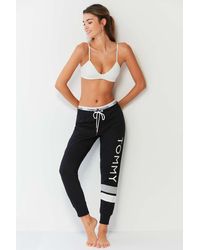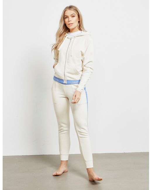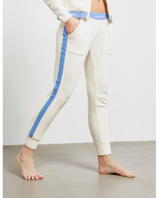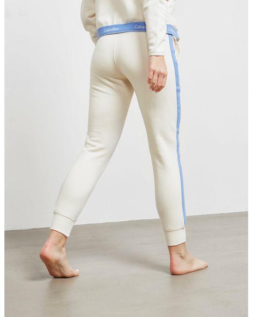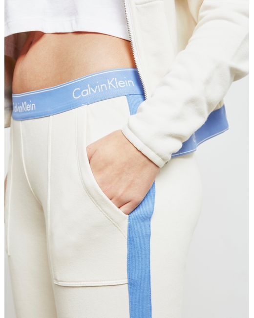 Calvin klein underwear unites their love of contemporary lines and timeless designs with these woman's band track pants which come in an ivory colourway and features their signature monogram branding to the waistband for that perfect sporting casual staple. Ivory colourway, cotton blend construction, elasticated waist band, ribbed cuffs, slim fit, two side pockets and branding to the waist band to complete. Model is 5'9.5" and wears a size 8. For matching hoodie search 084235. Colour: white