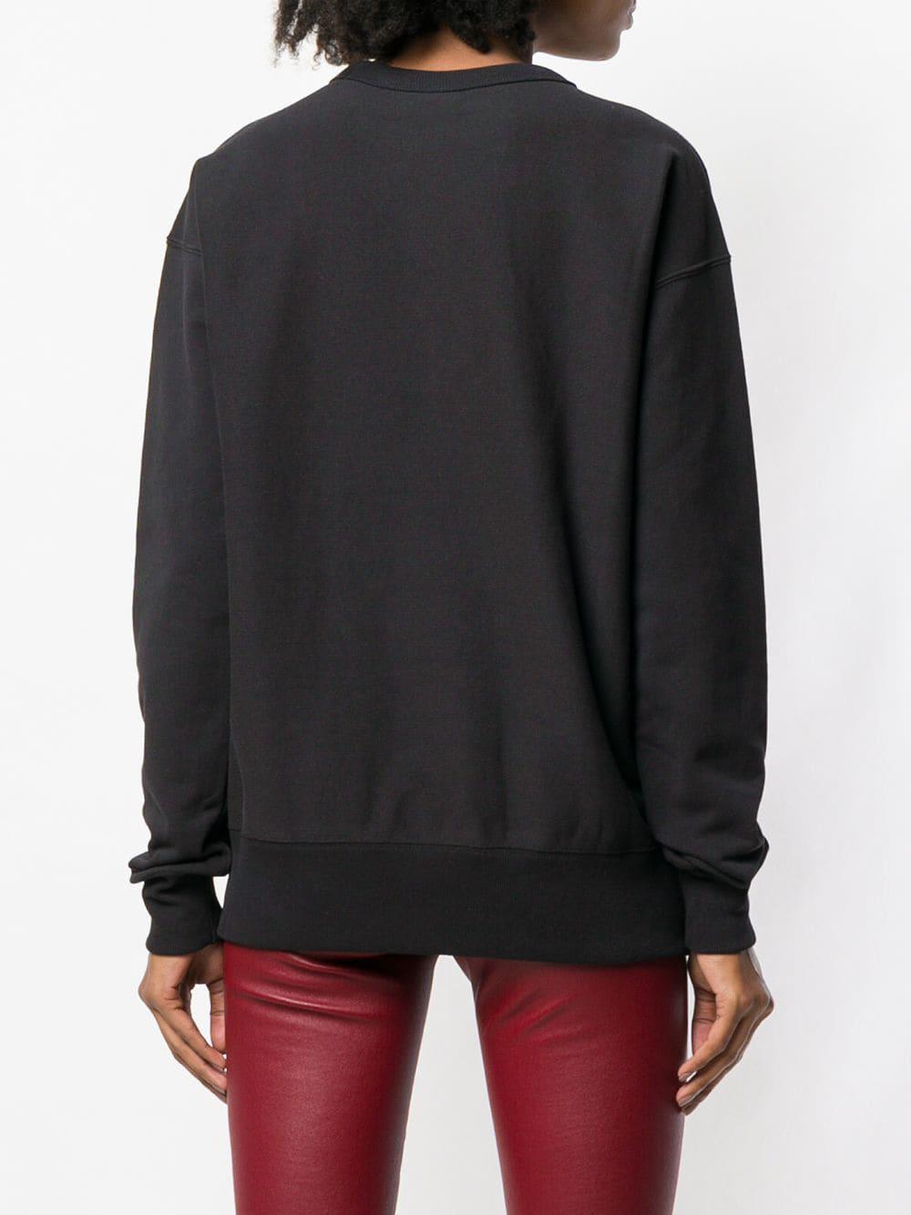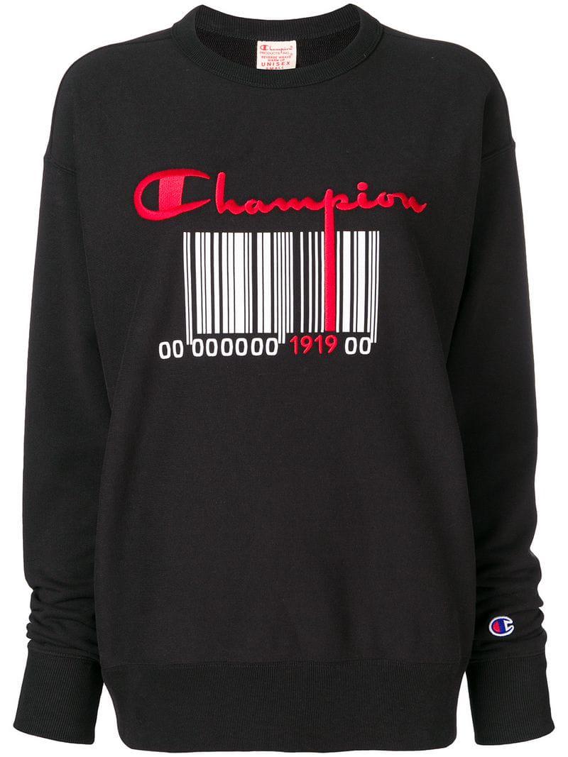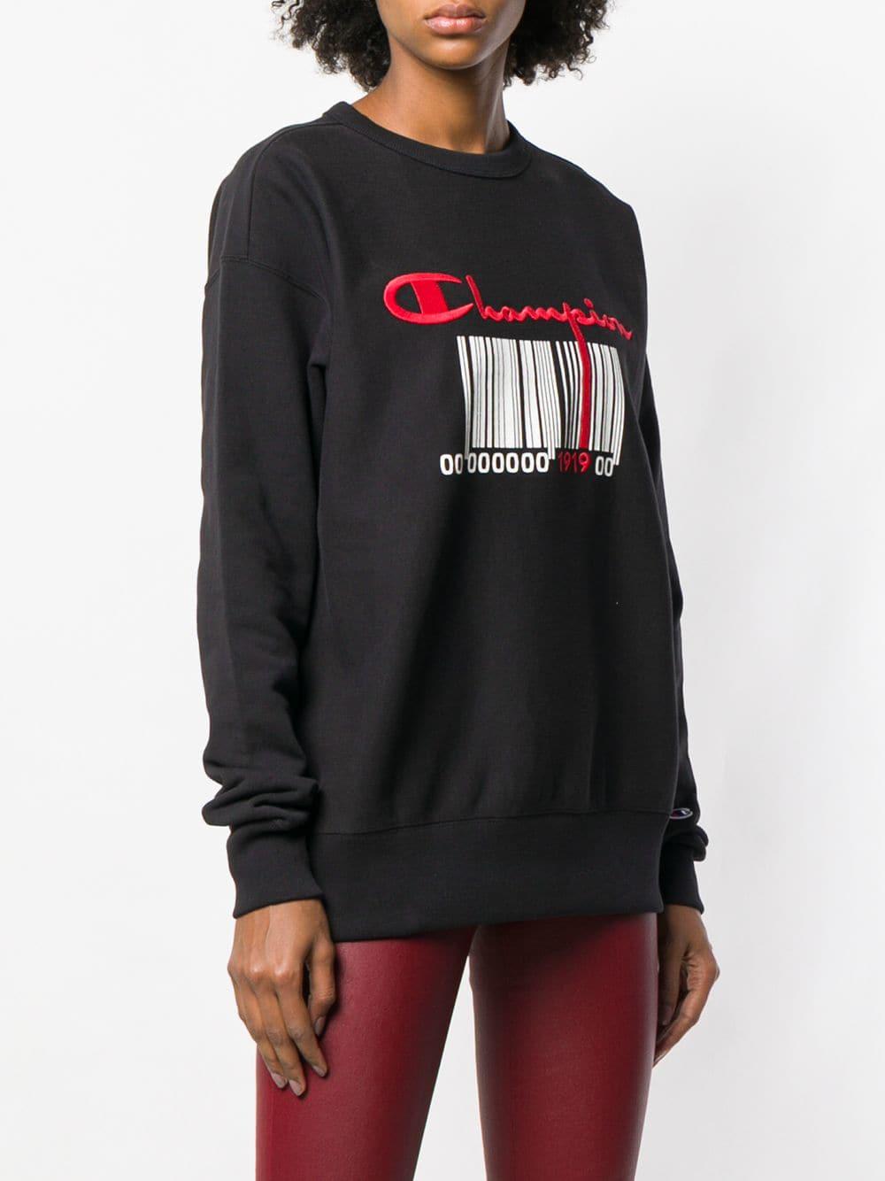 Black cotton barcode logo sweatshirt from Champion featuring a round neck, long sleeves, fitted cuffs, an embroidered designer logo to the chest and a central printed barcode below. Material:Cotton. Colour: black