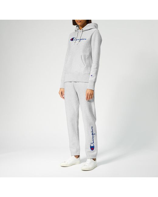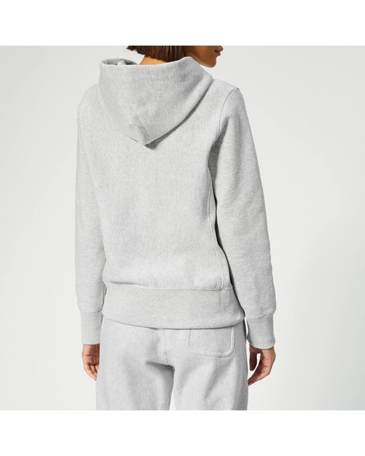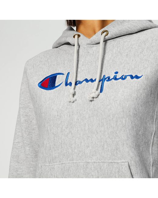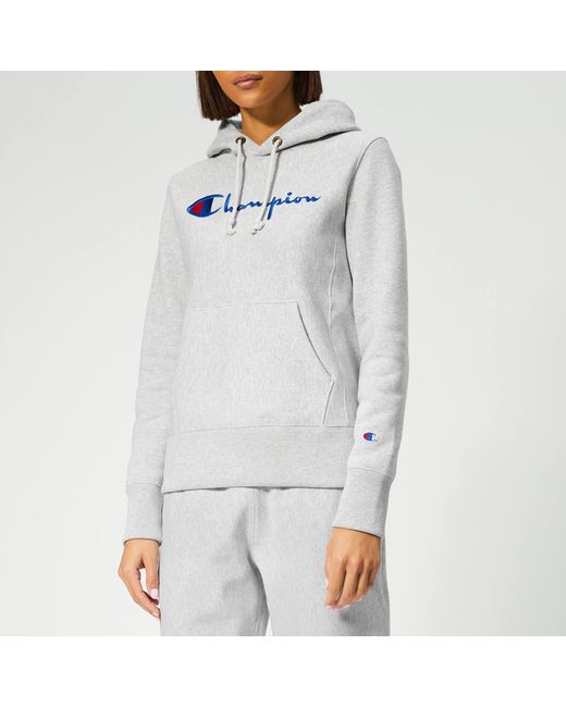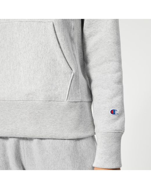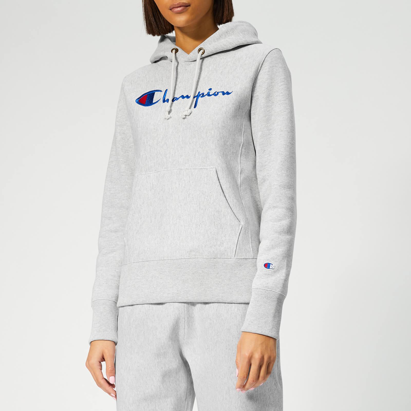Grey marl hoodie in a cosy cotton blend from Champion. The hooded sweatshirt features adjustable drawstring ties, a front kangaroo pouch pockets and ribbed trims at the cuffs and hem. Embroidered logo detail at the chest. Fleece lining. 86% Cotton, 14% Polyester. Model is 174cm/5'8.5" and wears a size S. Grey marl hoodie in a cosy cotton blend from Champion. The hooded sweatshirt features adjustable drawstring ties, a front kangaroo pouch pockets and ribbed trims at the cuffs and hem. Embroidered logo detail at the chest. Fleece lining. 86% Cotton, 14% Polyester. Model is 174cm/5'8.5" and wears a size S.