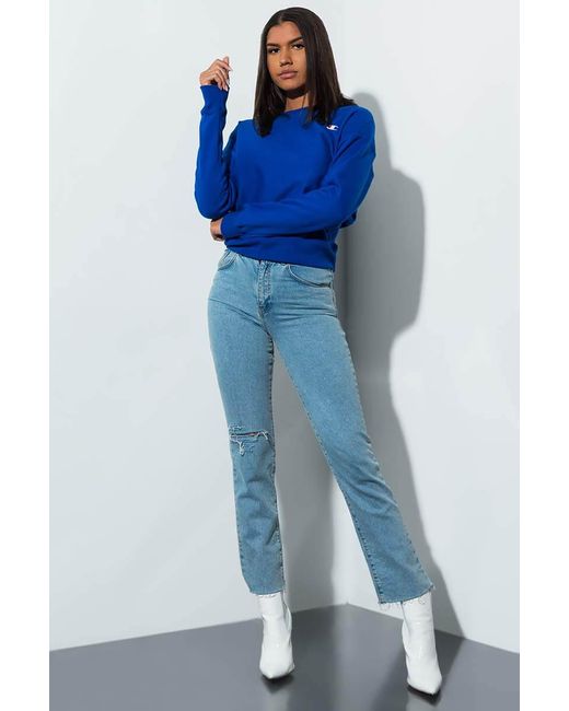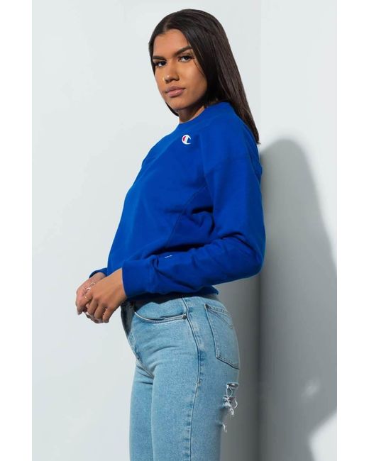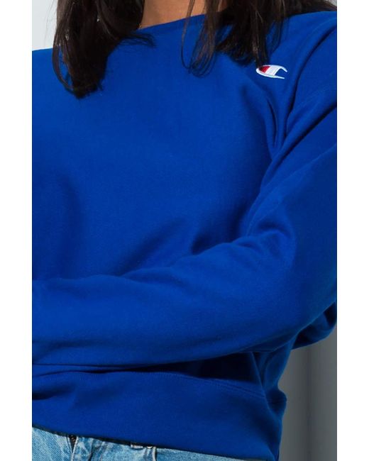 Your new fav sweatshirt. The champion women's small c reverse weave crew sweatshirt is made from a slightly stretchy fabrication with a ribbed crew neckline, drop shoulder sleeve with ribbed cuffs, a slightly boxy silhouette, and a ribbed banded hem. We need this in every colour. Fits true to size. 82% cotton 18% polyester. 24" shoulder to hem. Approx. Measured from hem). Machine wash cold. Model is wearing a size small. Product id: 410005457561. Colour: blue
