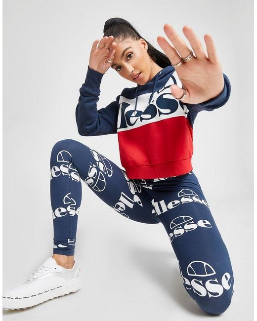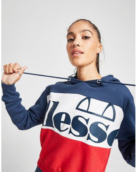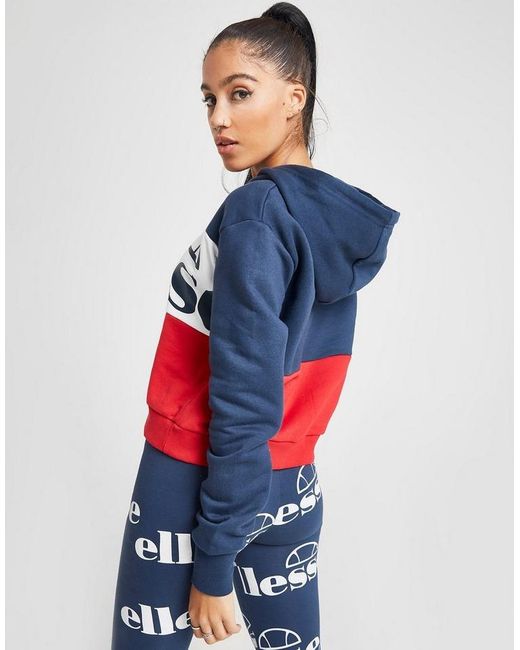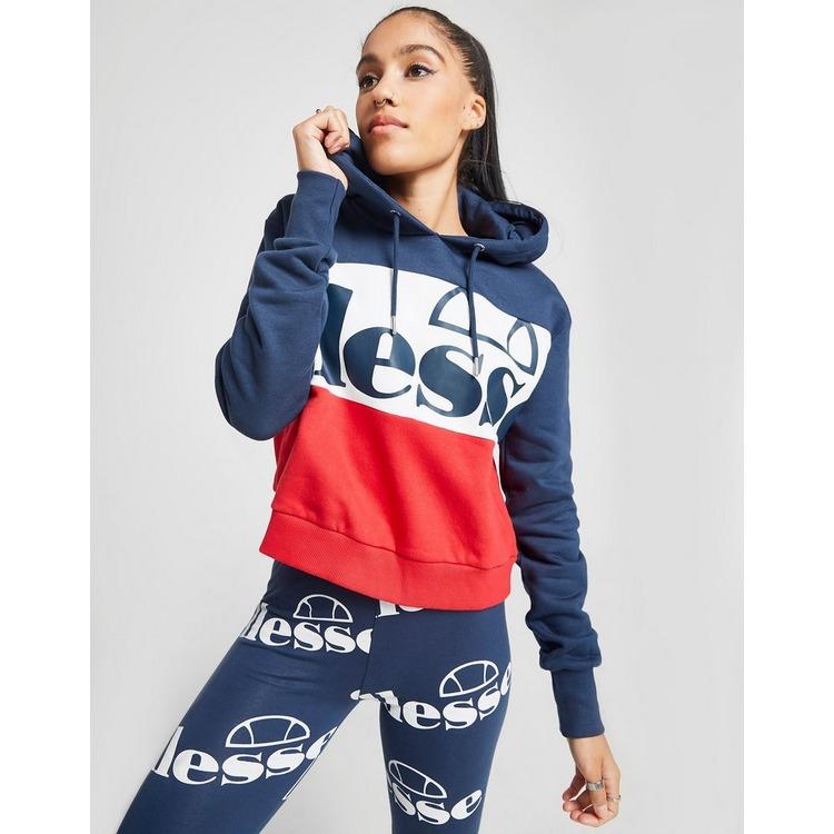 Layer up in bold, retro style with this women's Logo Panel Crop Hoodie from Ellesse. In a navy, white and red colour block design, this relaxed-fit hoodie is made from super soft cotton fleece fabric. It has a classic, overhead style and features an adjustable hood for cozy coverage. With ribbed trims to optimize the fit, this hoodie is finished up with oversized branding stamped to the chest. Wear it with Ellesse leggings for a statement retro look. Machine washable. Our model is 5'8" and wears a size 8. Material: 80% Cotton/20% Polyester. Colour: blue