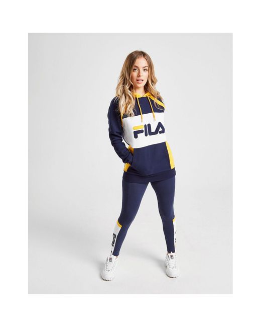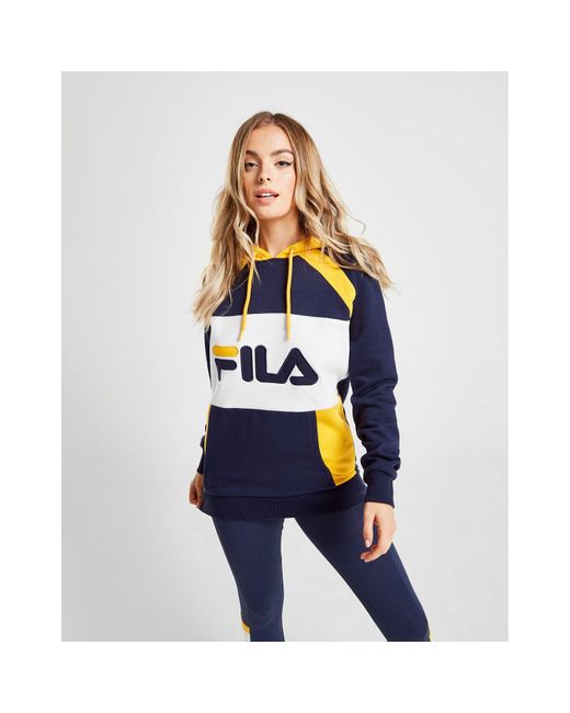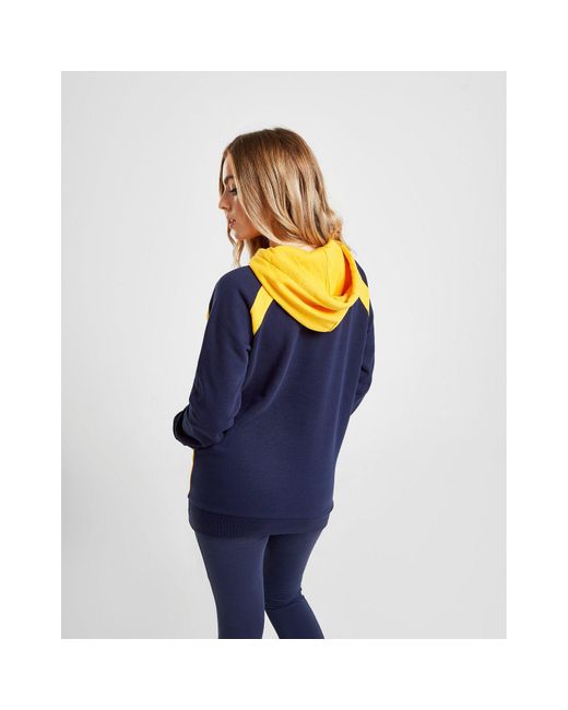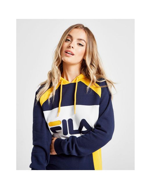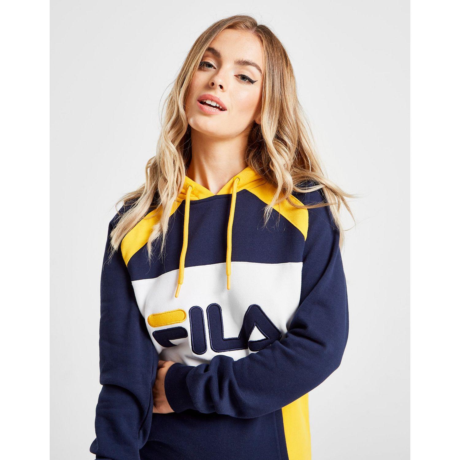 Layer up and work a retro look with this women's Stripe Panel Overhead Hoodie from Fila. Packed with '90s vibes, this relaxed-fit hoodie is made from a super soft cotton blend. It comes in a navy colourway and sports yellow and white colour block panelling for a bold look. With a classic, overhead design, this hoodie features a central kangaroo pocket and an adjustable hood for cozy coverage. Finished with signature Fila branding to the chest. Our model is 5'5" and wears a size 8. Colour: blue