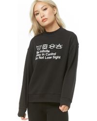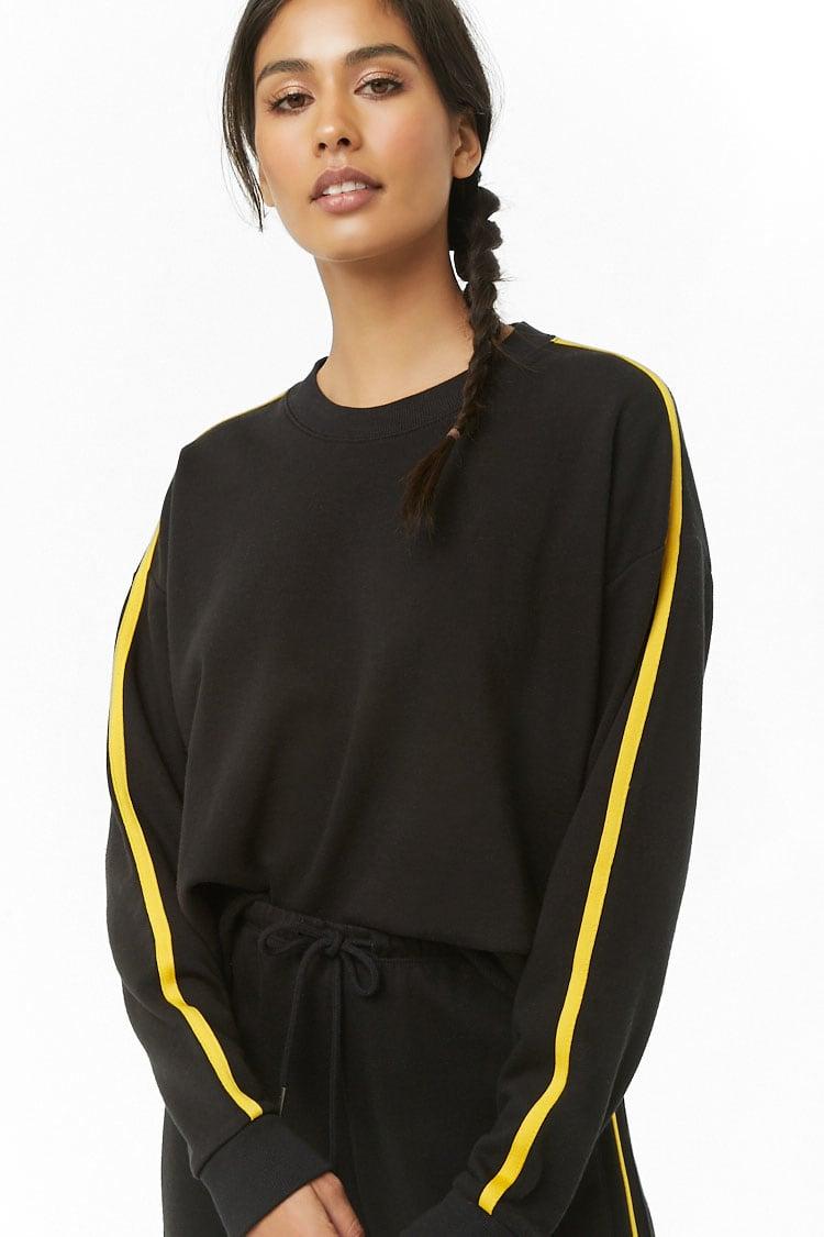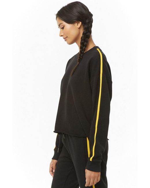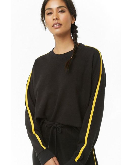 An athletic French terry knit sweatshirt featuring a striped trim design, crew neck, dropped shoulders, long sleeves, ribbed trim, boxy silhouette, and a raw-cut hem. Matching bottoms available. 59% cotton, 41% polyester. Hand wash cold. Model is 5'9.5 and wearing a Small. Women's Active Striped Sweatshirt. Black/Yellow. FOREVER 21. Colour: black