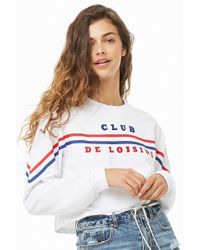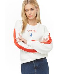 An athletic French terry knit sweatshirt featuring a striped trim design, crew neck, dropped shoulders, long sleeves, ribbed trim, boxy silhouette, and a raw-cut hem. Matching bottoms available. 59% cotton, 41% polyester. Hand wash cold. Size + Fit:. Model is 5'9.5%22 and wearing a Small.