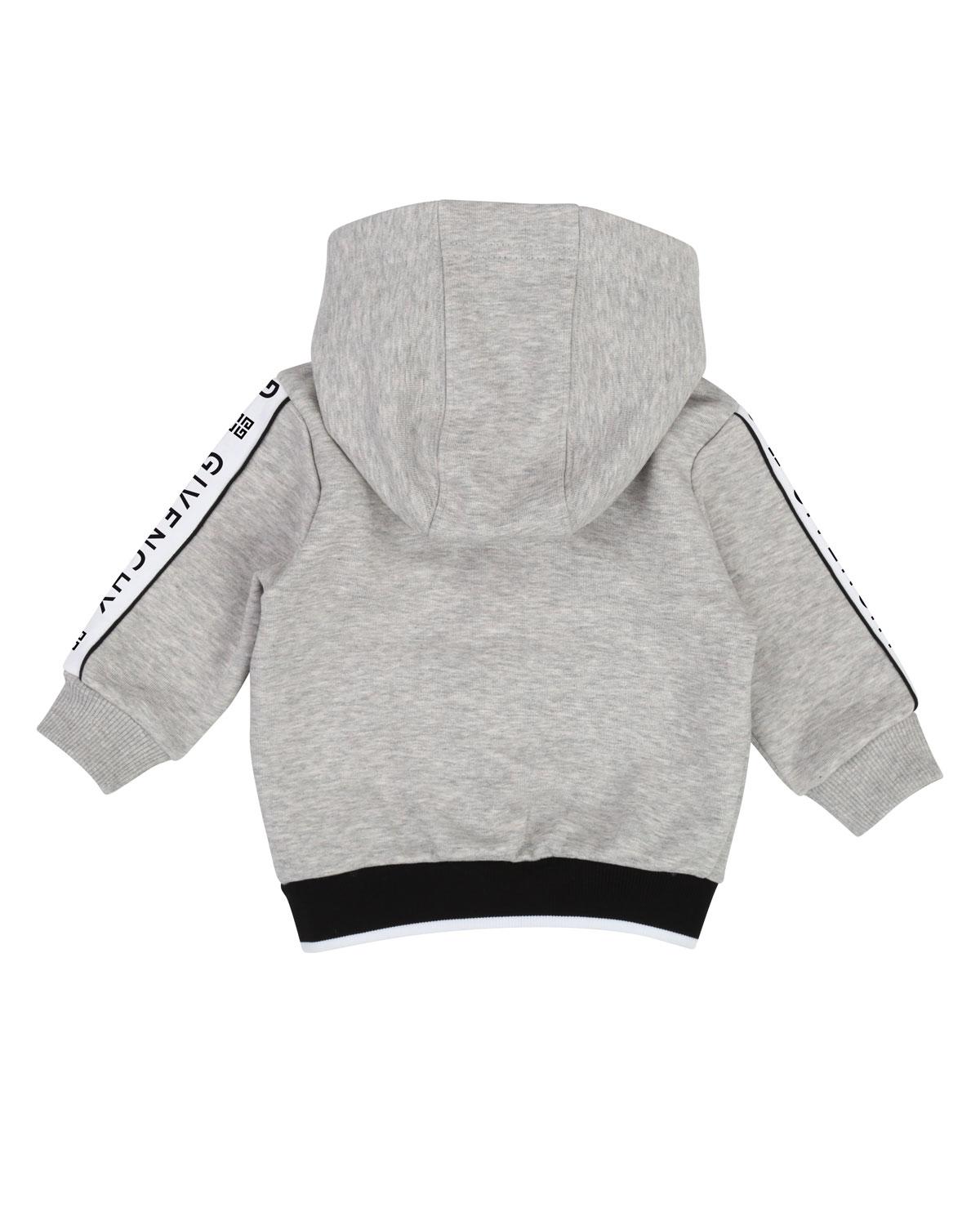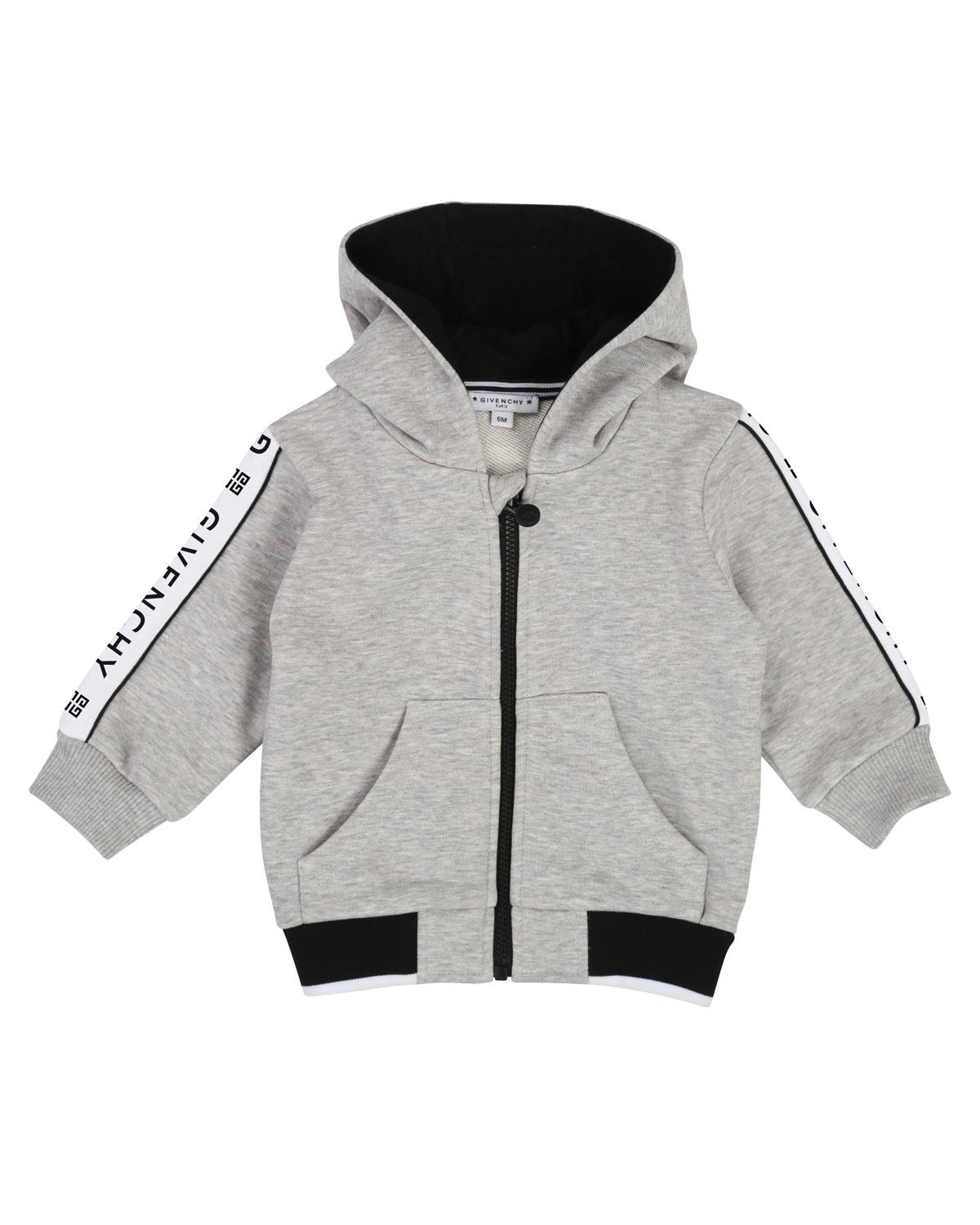 Givenchy heathered jacket with logo tape down sleeves. Hooded collar; full zip front. Long sleeves. Ribbed, banded cuffs and hem. Two-tone hem. Split kangaroo pockets. Body: cotton/polyester. Trim: nylon/spandex. Lining: cotton. Colour: grey