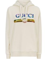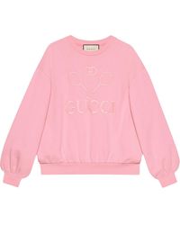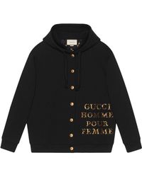 Crewneck; Long sleeves; Pullover style; Dropped shoulders; GG goldtone buttons; Block lettering detail; Oversize fit; About 28" from shoulder to hem; Cotton; Dry clean; Made in Italy; Model shown is 5'10" (177cm) wearing a US size Small.