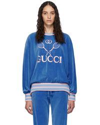 The final act of Gucci's "French Trilogy," the Spring Summer 2019 collection is dotted with French mottos as a tribute to the country. The runway show was presented in the Théâtre Le Palace in Paris, which was originally constructed in the 17th century as a music and dance hall and later evolved into a club in the '70s. This sweatshirt features a "Gucci pour la Côte d'Azur" patch—a French phrase that translates to "Gucci for the French Riviera. Blue and ivory striped cotton jersey; Black "Gucci pour la Côte d'Azur" patch on the front; Button detail on the shoulders;100% cotton; Made in Italy; The model is 172cm and is wearing size large. Material:Cotton. Colour: blue