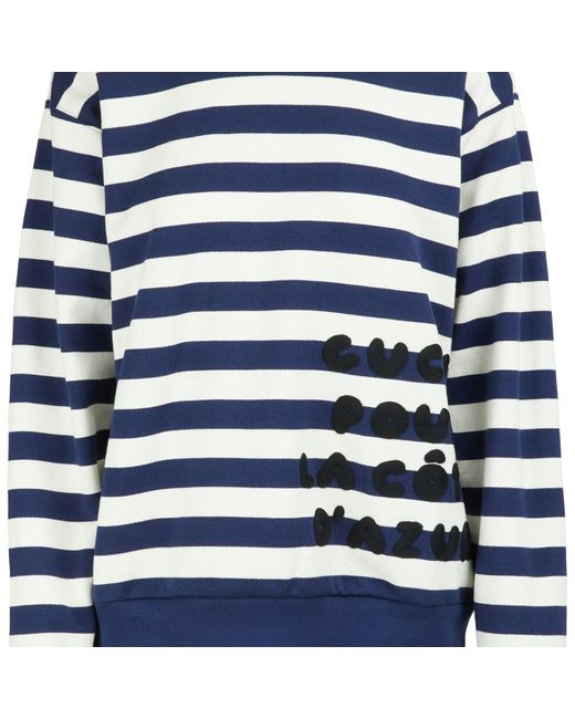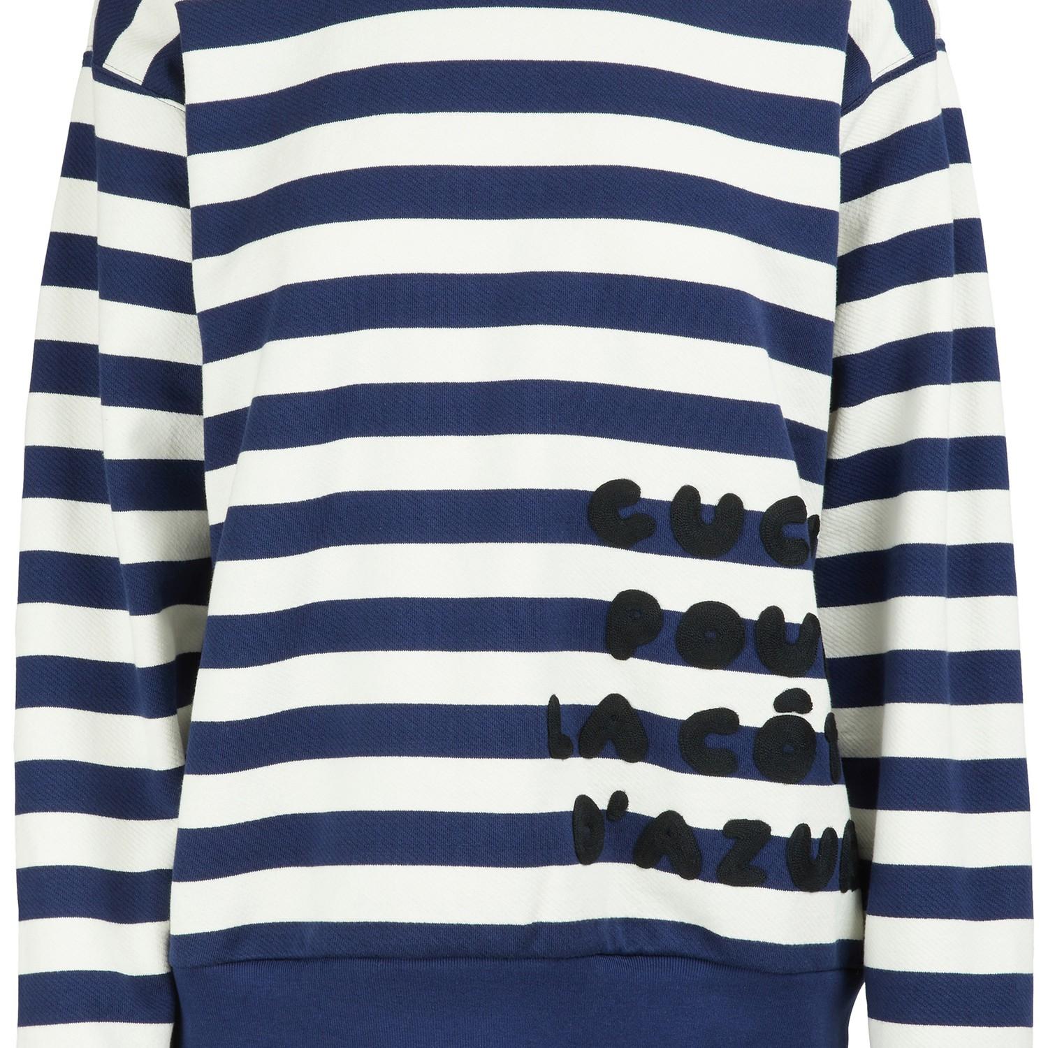 The final act of gucci's french trilogy," the spring summer 2019 collection is dotted with french mottos as a tribute to the country. The runway show was presented in the théâtre le palace in paris, which was originally constructed in the 17th century as a music and dance hall and later evolved into a club in the '70s. This sweatshirt features a gucci pour la côte d'azur patch-a french phrase that translates to gucci for the french riviera. Blue and ivory striped cotton jersey black gucci pour la côte d'azur patch on the front button detail on the shoulders 100% cotton made in italy the model is 5'7 and is wearing size large.