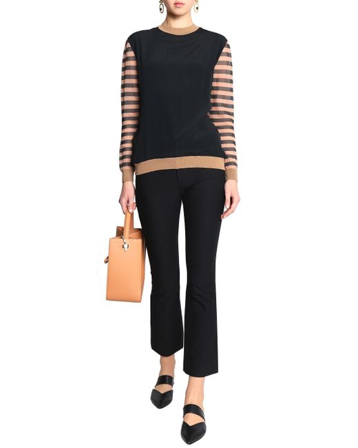 Top Crepe de chine Knitted Ribbed trims Long sleeves Round collar Slips on Hand wash. Made in Spain. 36% Silk, 23% Cotton, 21% Polyamide, 20% Acetate. Colour: black