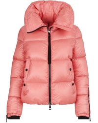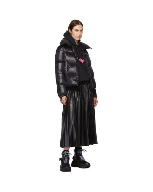 Long sleeve quilted nylon down-filled jacket in black. Stand collar. Two-way zip closure at front. Welt pockets at waist. Embroidered logo applique in white, navy, and red at upper sleeve. Zippered vent at cuffs featuring underlay construction. Logo flag and graphic logo patch at interior. Gunmetal-tone and black hardware. Colour: black