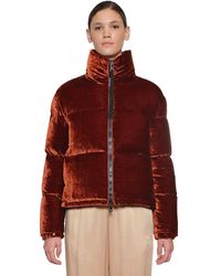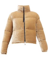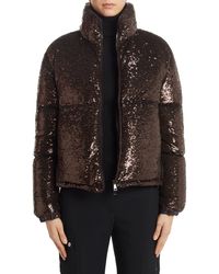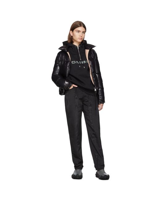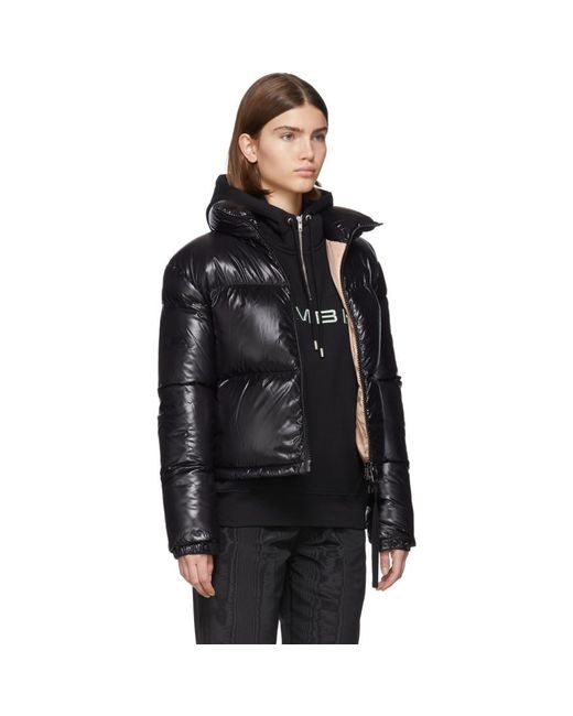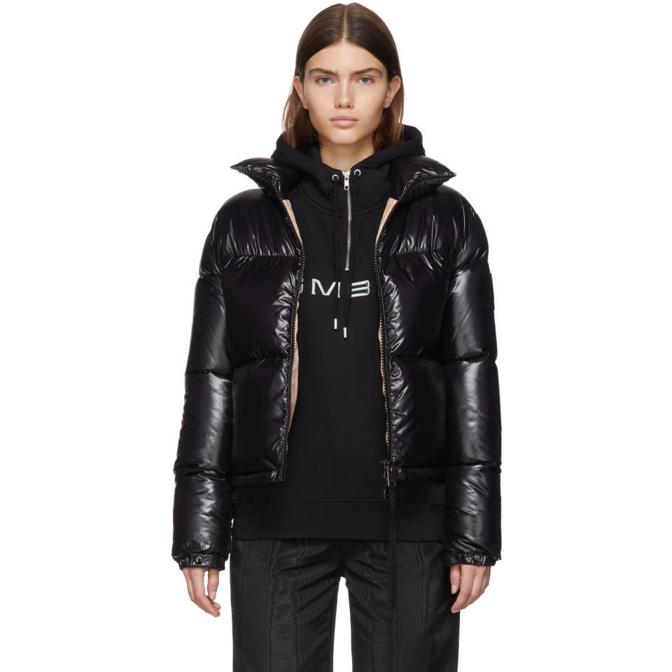 Long sleeve down-filled quilted nylon jacket in black. Stand collar. Zip closure at front featuring tonal grosgrain pull-tab. Logo patch in black at sleeve. Adjustable press-stud tab at elasticized cuffs. Adjustable bungee-style drawstrings at hem. Nylon satin lining in beige. Colour: black