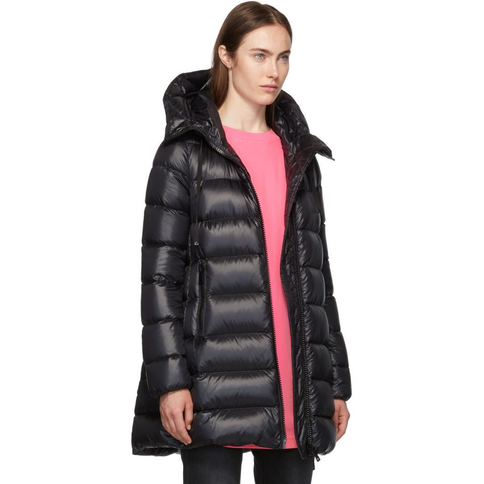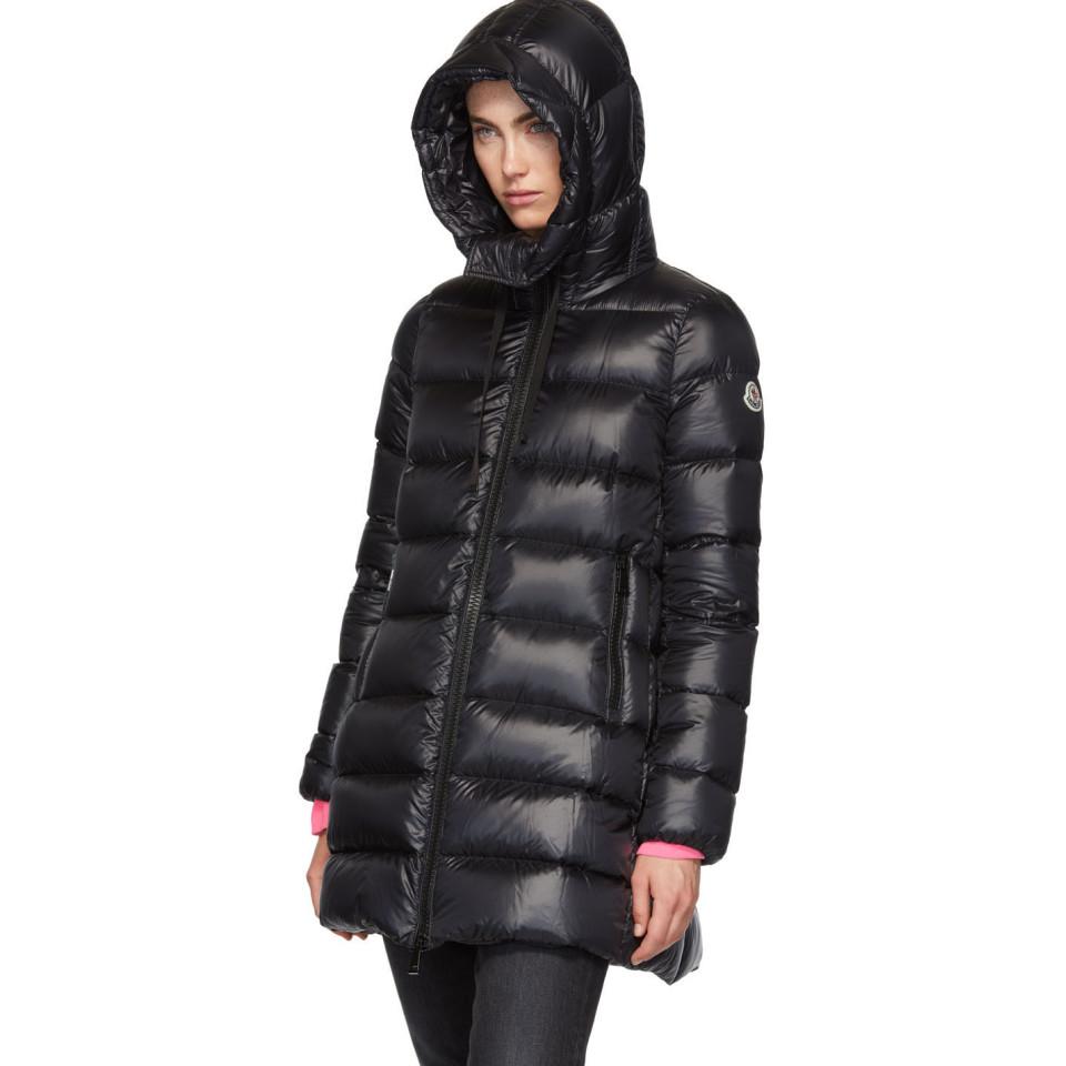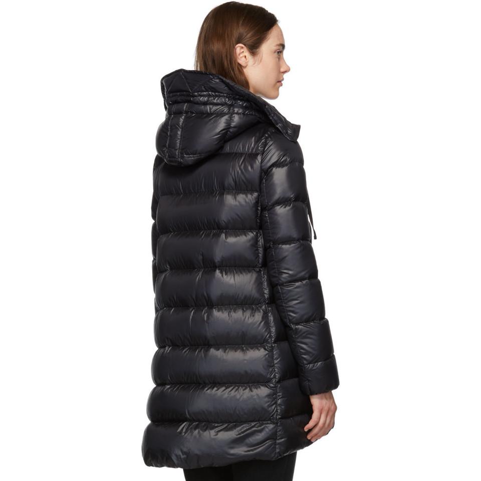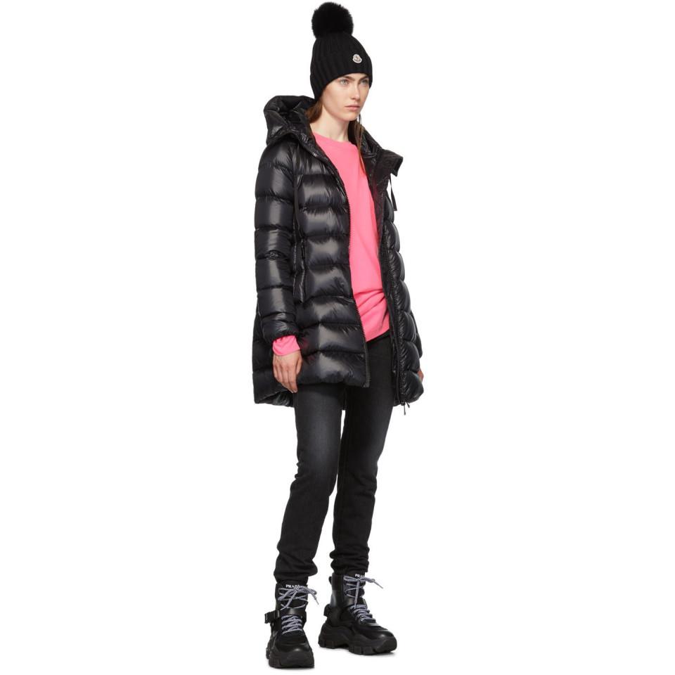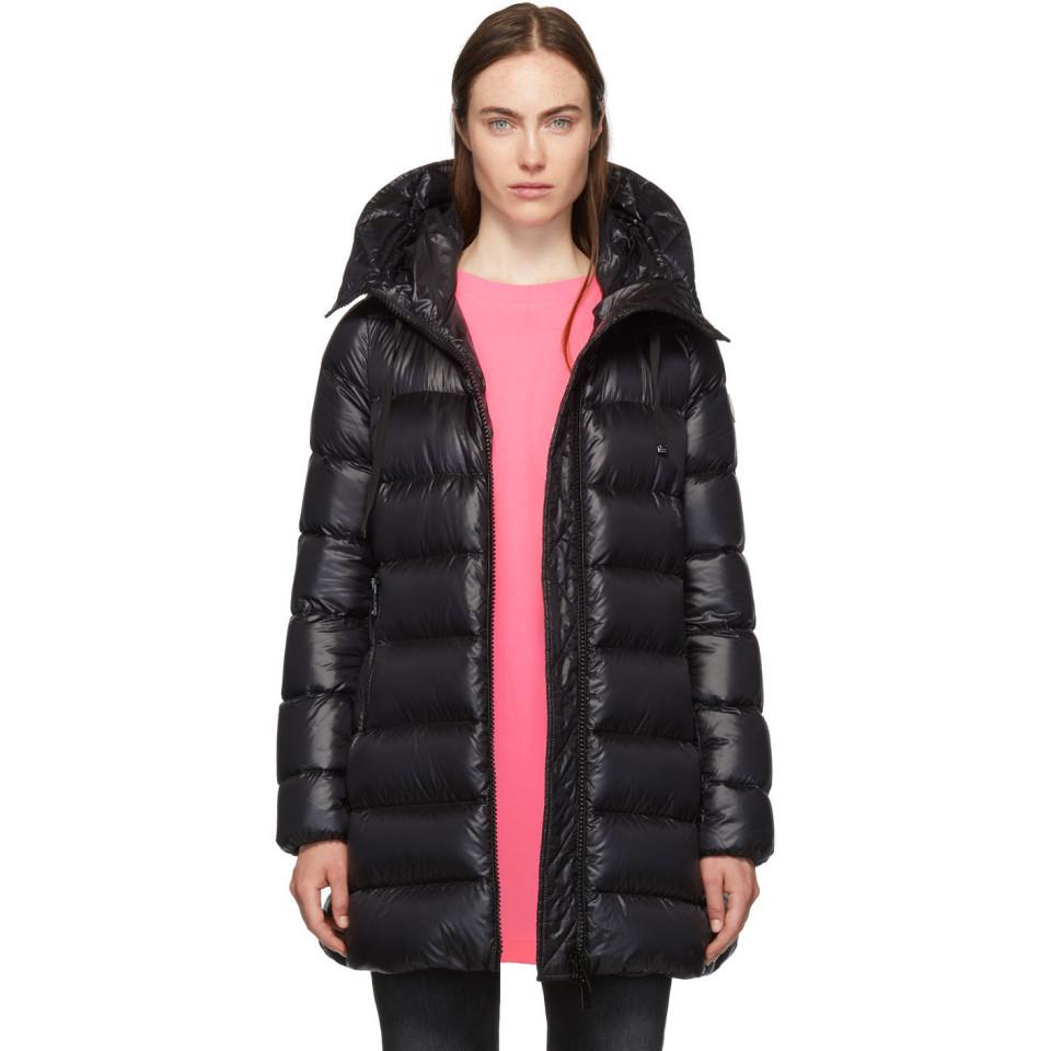 Go to SSENSELong sleeve quilted nylon down-filled jacket in black. Drawstring at hood. Two-way zip closure at front. Zippered pockets at waist. Embroidered logo applique in white, navy, and red at upper sleeve. Elasticized cuffs. Logo flag and graphic logo patch at interior. Gunmetal-tone hardware. Colour: black