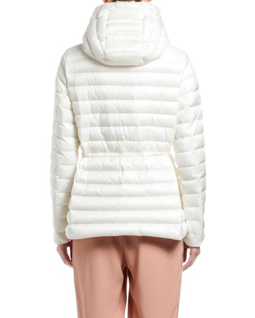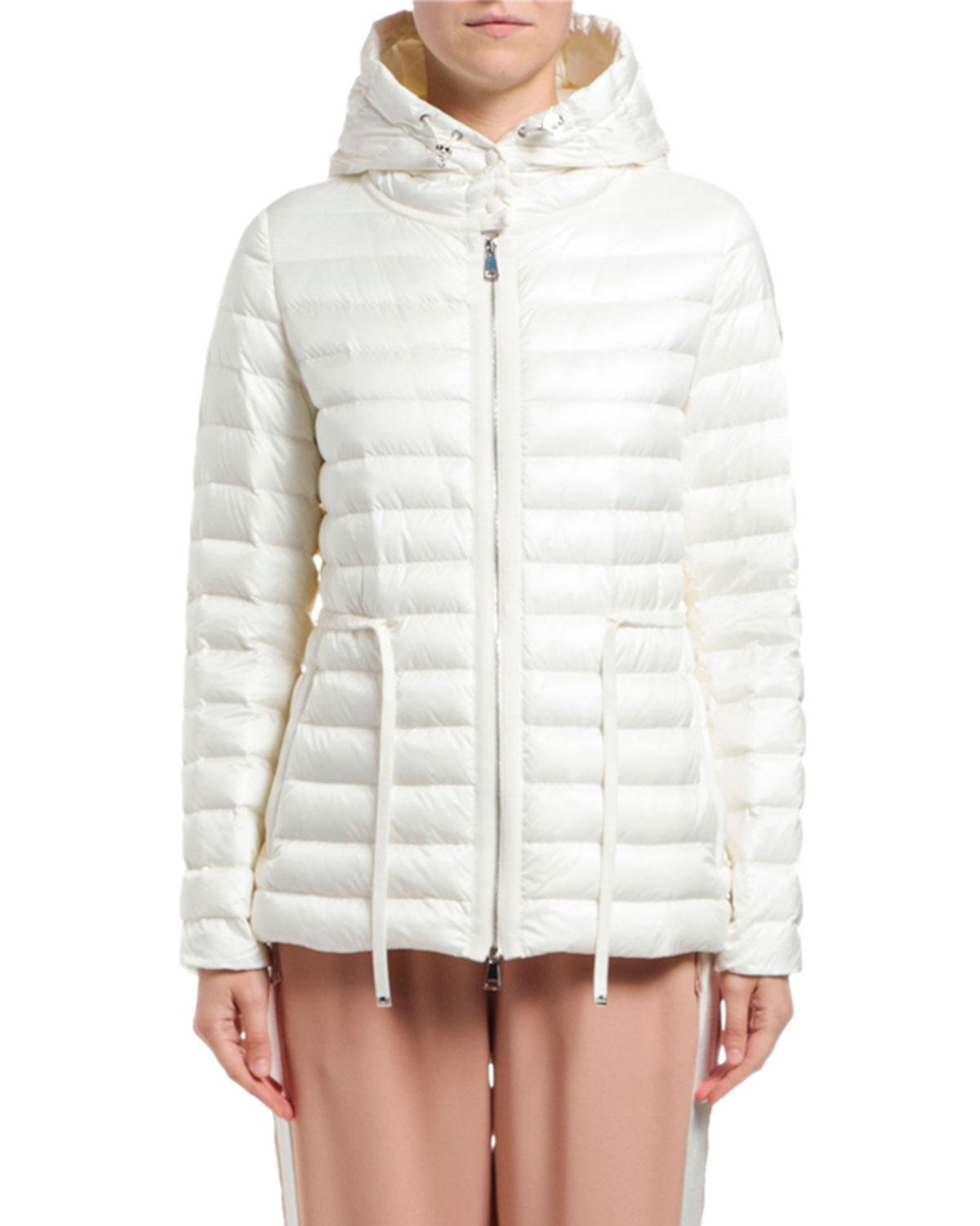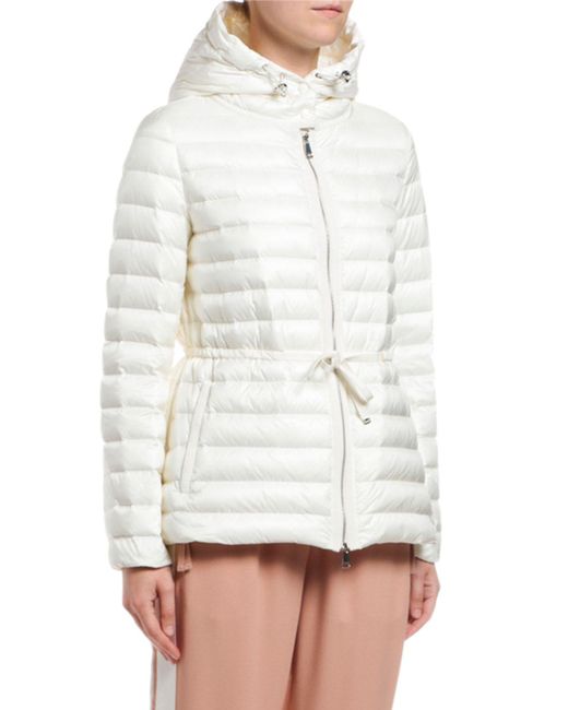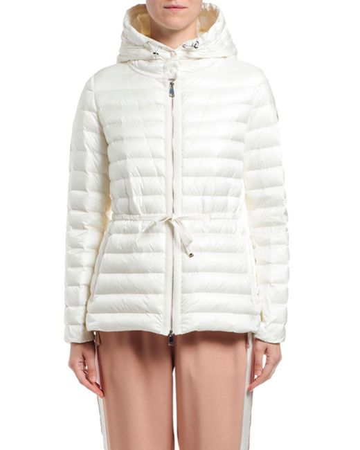 Moncler "Raie" puffer coat. Drawstring hood. Long sleeves; logo at left arm. Fit-and-flare silhouette. Lower welt pockets. Drawstring at waist. Below-hip length. Nylon outer shell/lining. 90/10 down/feather fill. Colour: white