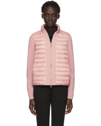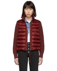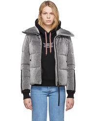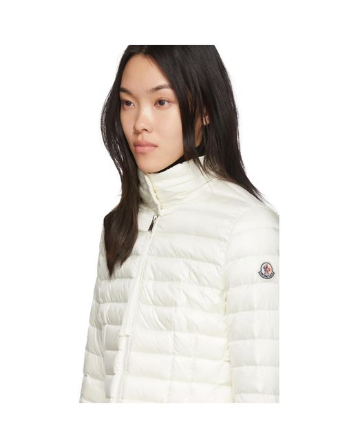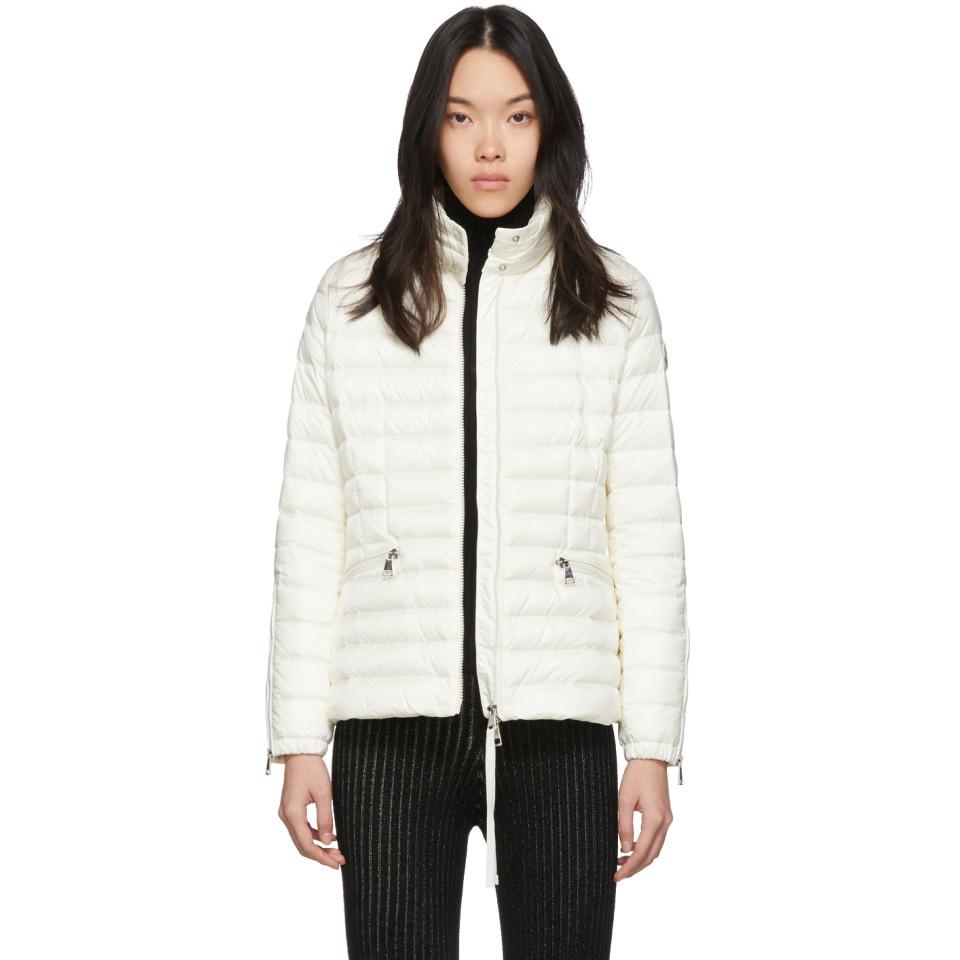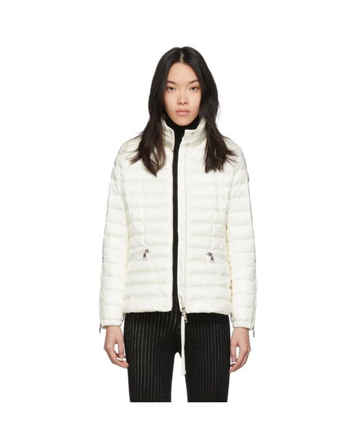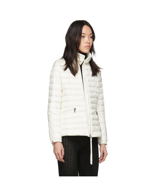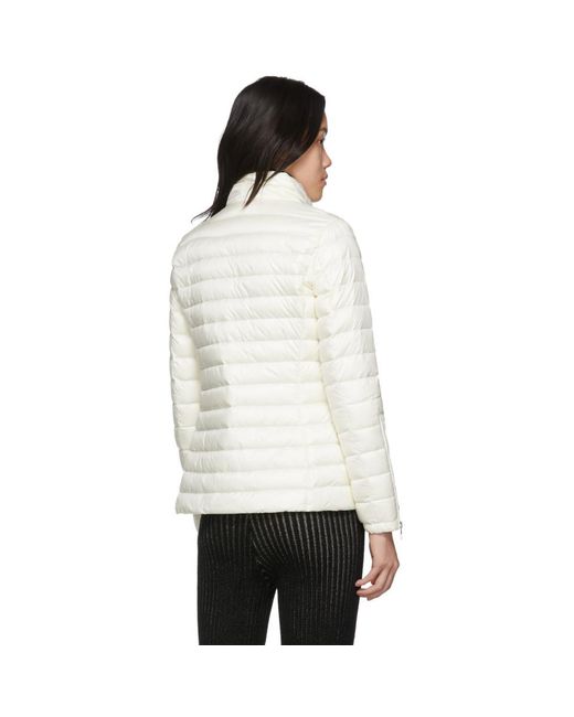 Long sleeve down-filled quilted nylon satin jacket in white. Press-stud fastening at stand collar. Two-way zip closure at front. Zippered pockets at waist. Tricolor felted logo applique at upper sleeve. Nylon canvas inset cuffs featuring logo webbing trim and zippered vent. Locker loop at interior. Fully lined. Logo-engraved silver-tone hardware. Colour: white