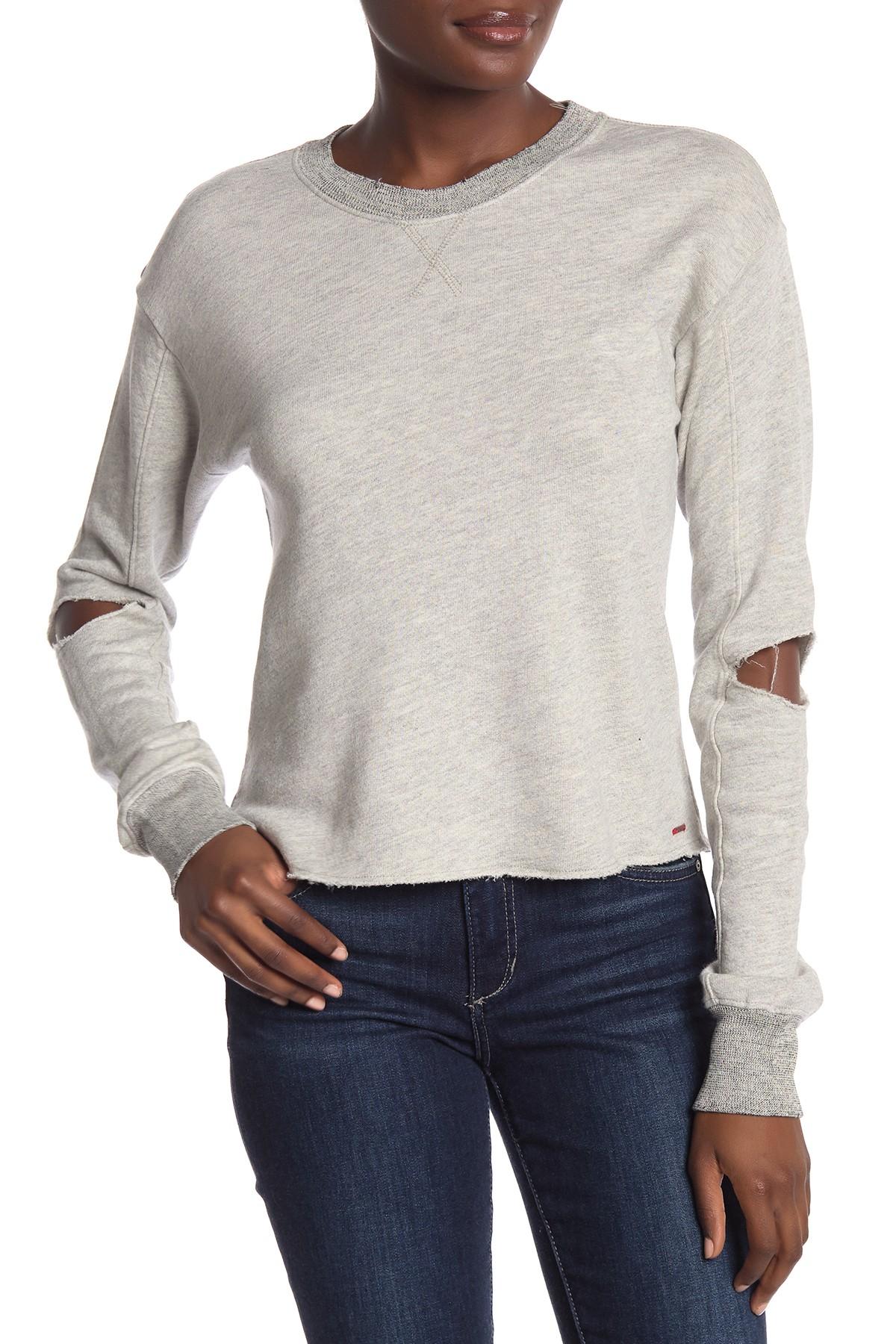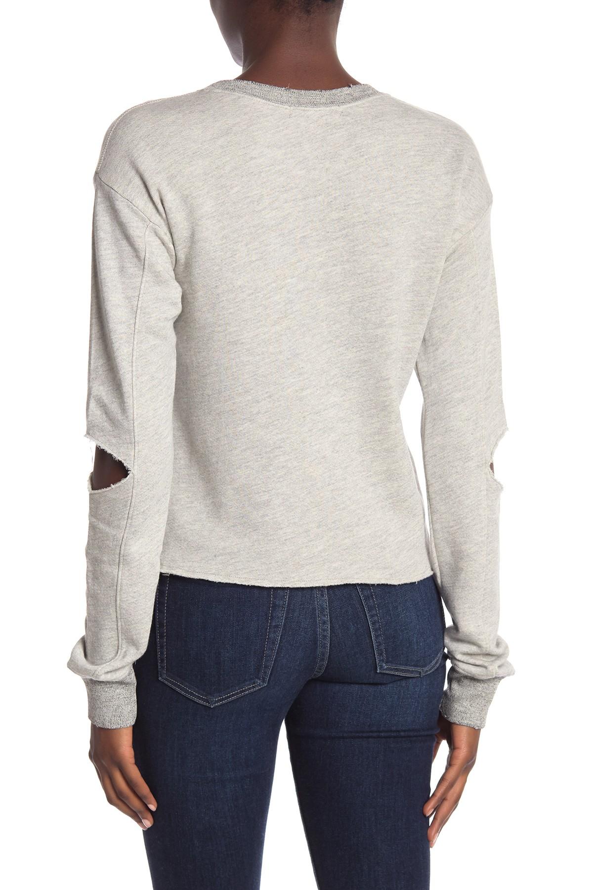 Go to Nordstrom RackA distressed pullover with elbow cutouts adds effortless style and comfort. Fit: this style fits true to size. Crew neck. Long dolman sleeves with cutout elbows. Pullover style. Heathered. French terry knit. Distressed. Raw hem. Approx. 20.5" length (size S). Made in USA. N:PHILANTHROPY supports Children's Hospital Los Angeles and the ASPCA. 67% cotton, 33% viscose. Bust: 34". Waist: 24". Hips: 35". Model is wearing size S. Colour: grey