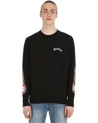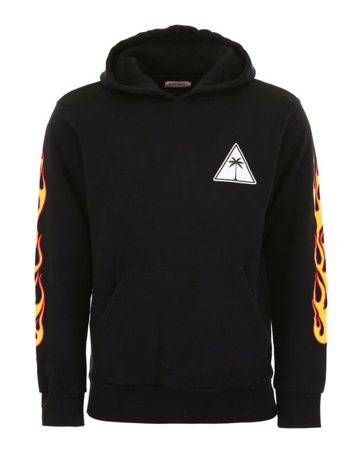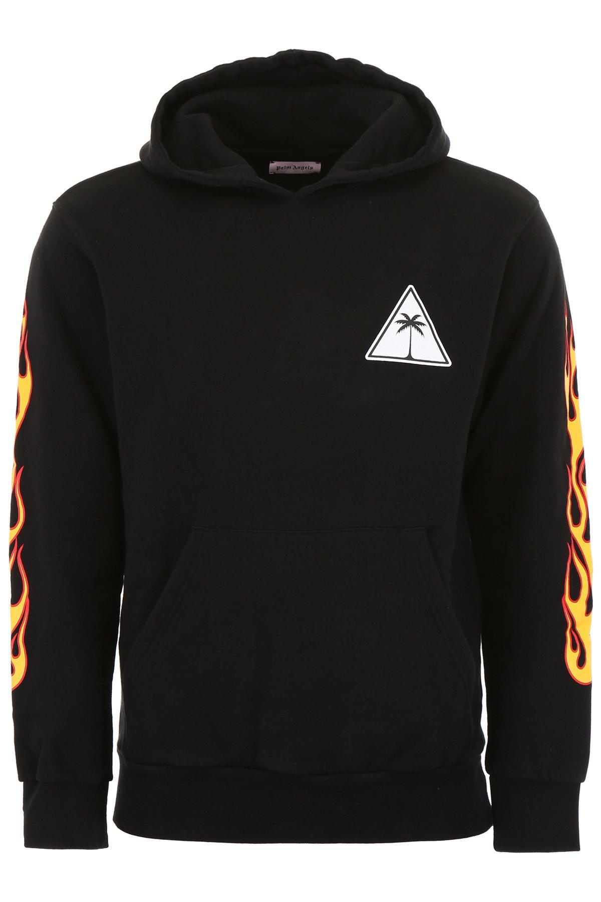 Palm Angels cotton jersey hoodie with fleece lining. It features a kangaroo pocket, print on the chest, "flames" on the sleeves. Relaxed fit. Model height is 182 cm and he is wearing a size M. Season: Fall-winter. Design: Print. Composition: 100% cotone. Topwear wearability: Con cappuccio, Long sleeves.