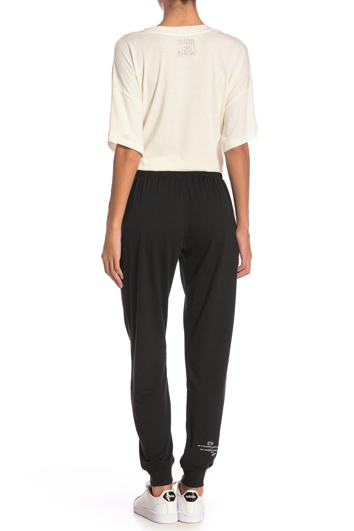 Go to Nordstrom RackFit: this style fits true to size. Drawstring waist. 4 slit pockets. Graphic at front and back leg. Banded cuffs. Knit construction. Approx. 9" rise, 29" inseam (size S). 62% polyester, 33% viscose, 5% spandex. Bust: 32". Waist: 25". Inseam: 34". Model is wearing size S. Colour: black
