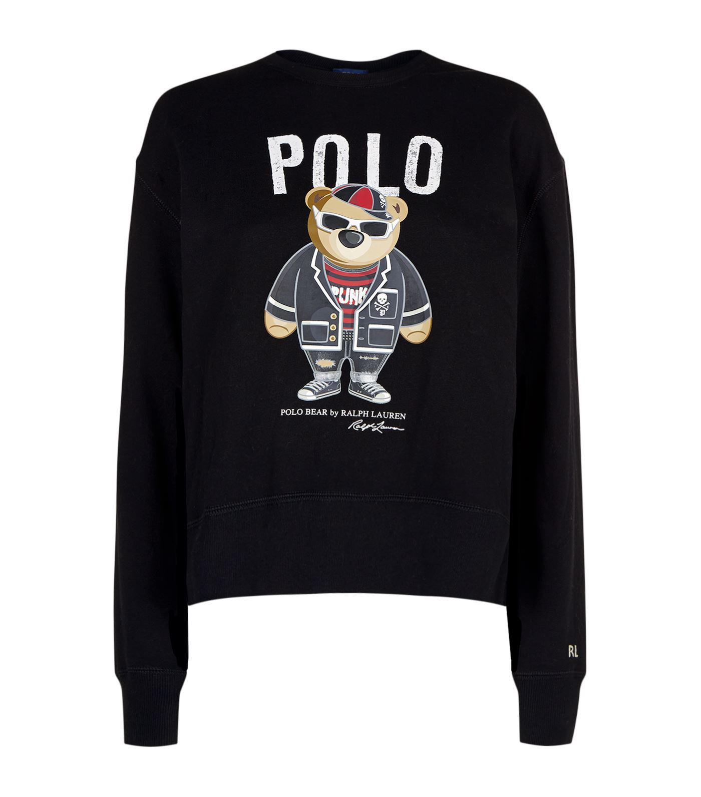 Go to HarrodsPolo Ralph Lauren - A Ralph Lauren icon first introduced in 1991, the Polo Bear is delightfully reimagined atop this crewneck sweatshirt, standing rebelliously with a rock'n'roll stance and characterised with a charming textured nose. Crafted with super-soft cotton, this namesake design features a flattering hip length adorned with cozy ribbed knit trims. Colour: black