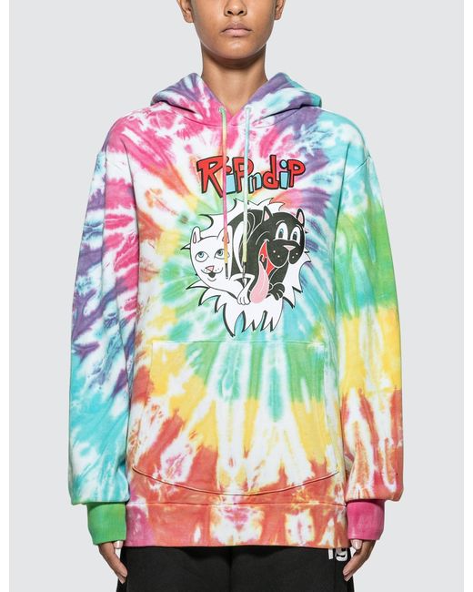 RIPNDIP- Nerm & Jerm Show Hoodie- Regular fit- Ribbed cuffs and hem- Kangaroo pocket- Drawstring hood- All over tie dye in rainbow colorways - Nerm and Jerm motif graphic on front, back and hood- Color: Rainbow Spiral Dye- 100% Cotton- See more Hoodies and Clothing". Colour: multicolour