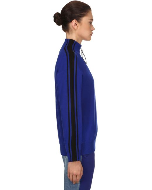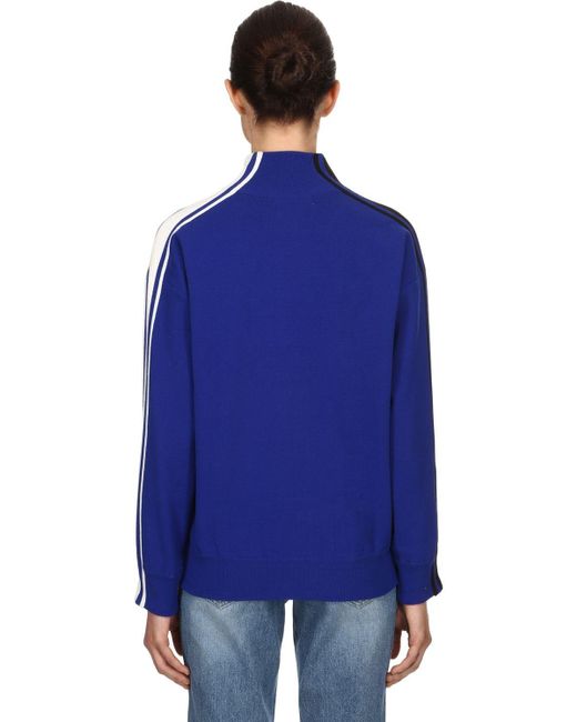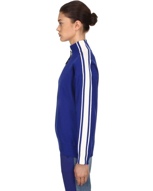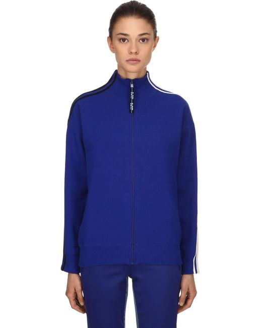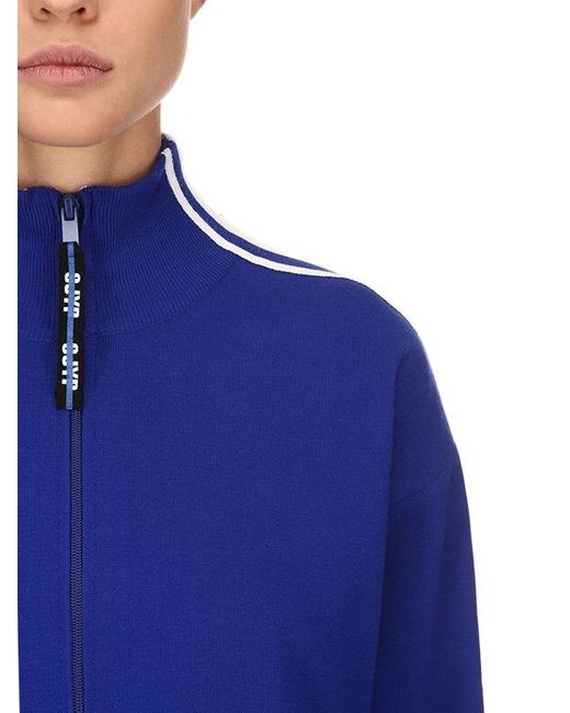 High collar. Front zip closure. Ribbed cuffs and hem. Contrasting colour bands on sleeves. Logo detail. 37%co37%pc26%pl. Colour: blue