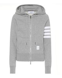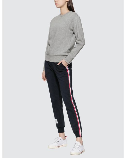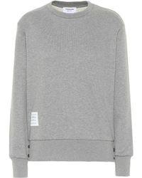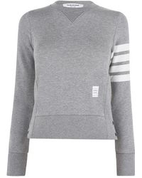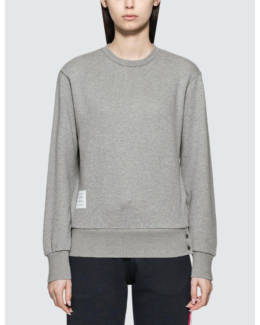 Thom Browne - Classic Crewneck Sweatshirt- Ribbed collar, cuffs and hem- Regular fit- Signature tricolor stripe on back- Interior signature tricolor stripe on cuffs and hem- Signature tricolor Grosgrain flag at back- Branding patch on hem in White- Button details on cuffs and hem- Color: Grey- 100% Cotton- Made in Italy- See more Sweatshirts and Clothing". Colour: grey