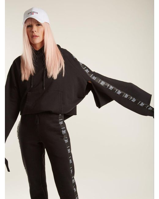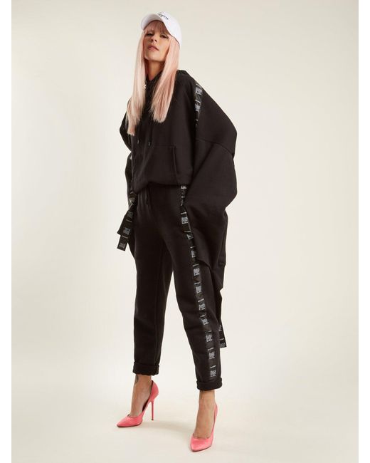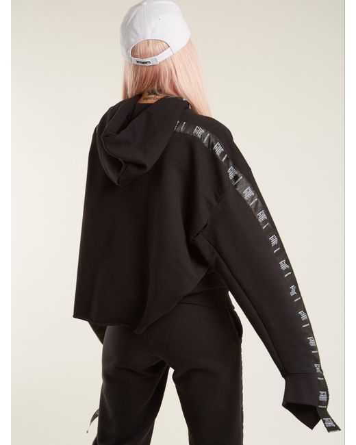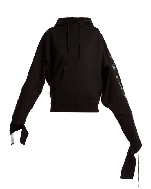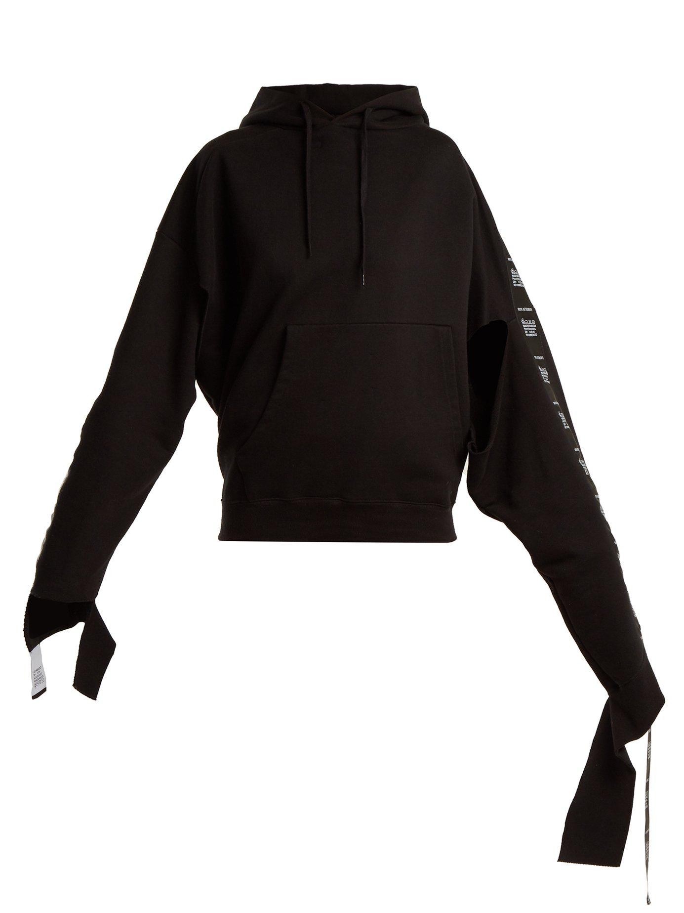 Vetements - this black hooded cotton-blend jersey sweatshirt by vetements is a contemporary deconstruction of a streetwear essential. The extra-long sleeves are ripped at the cuffs and layered with logo-print tape that trails over the hands. Double the impact with the label's matching track pants. Cotton.