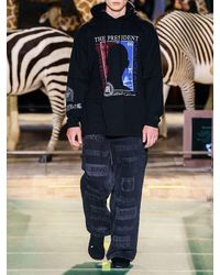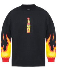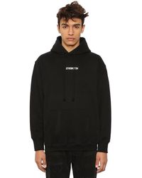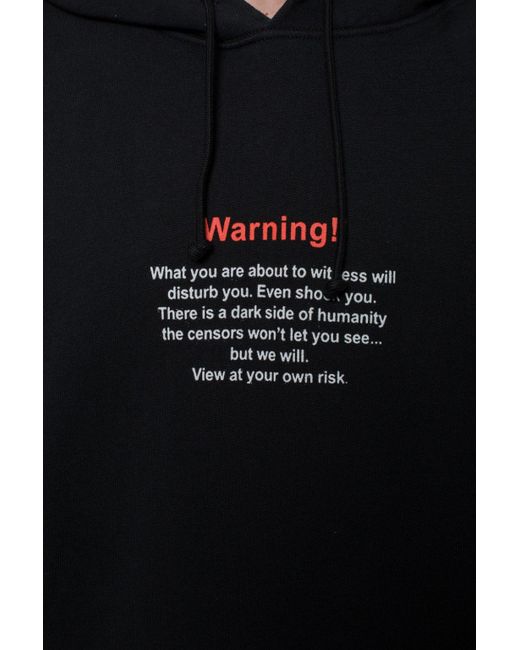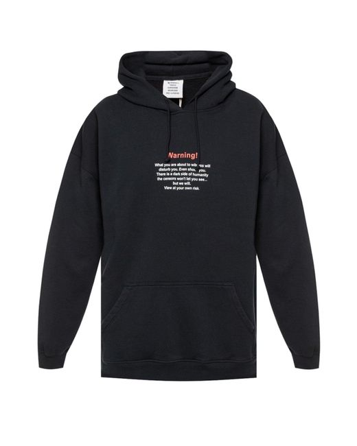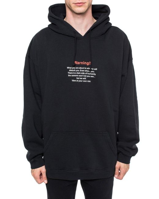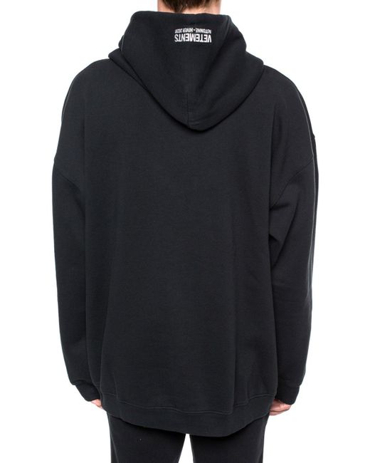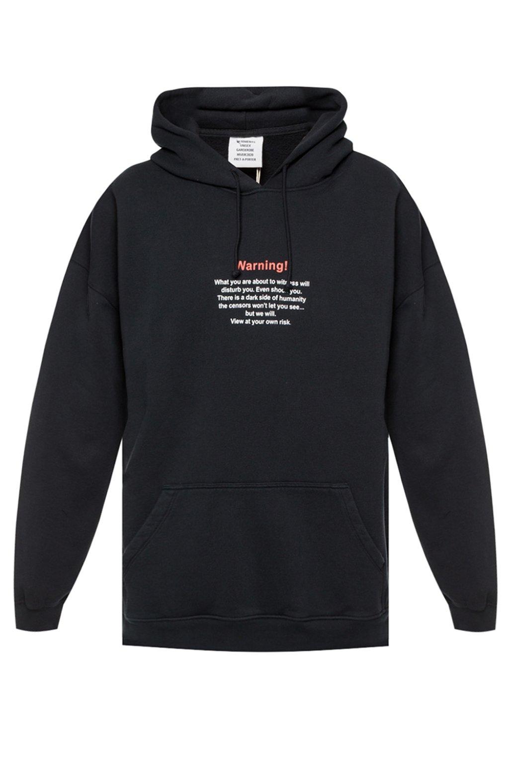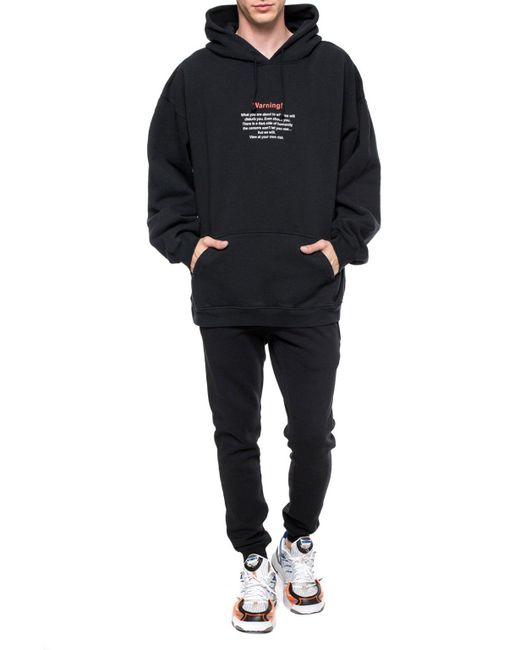 Black oversize sweatshirt from Vetements. Made of cotton. Decorated with a white and red print. Drawstring hood. Two slip pockets on the front. Ribbed bottom hem and cuffs. 100% Cotton. Model's Measurements. Height: 193cm. Chest: 95cm. Waist: 82cm. Hips: 93cm. Colour: black