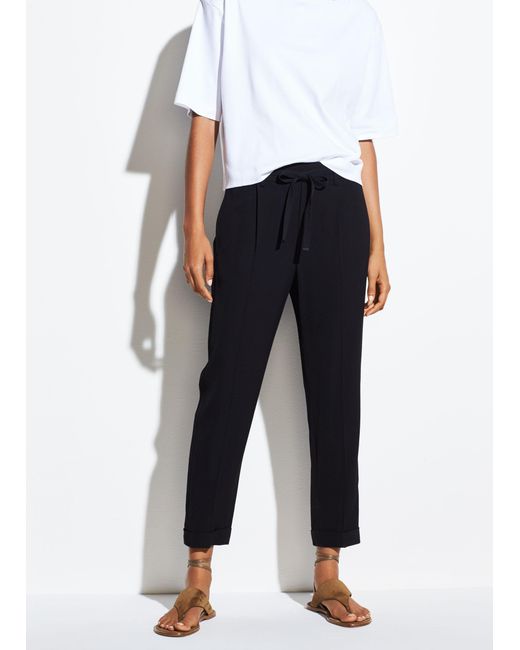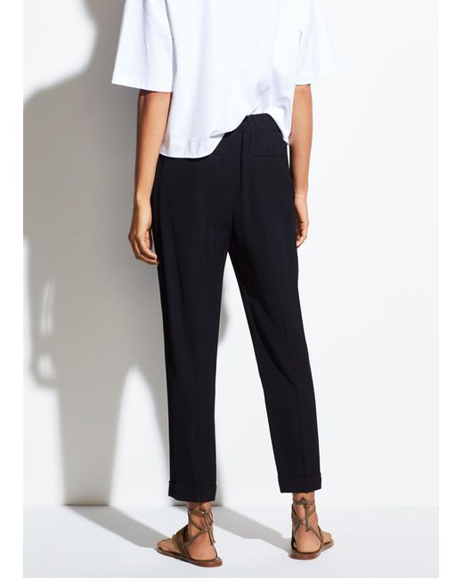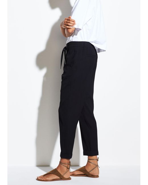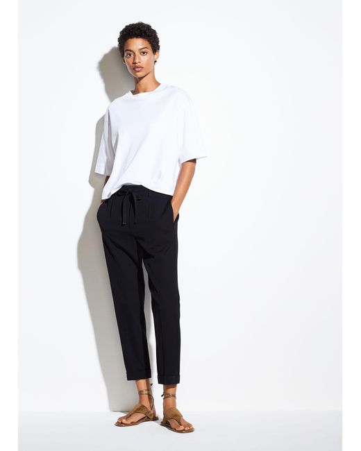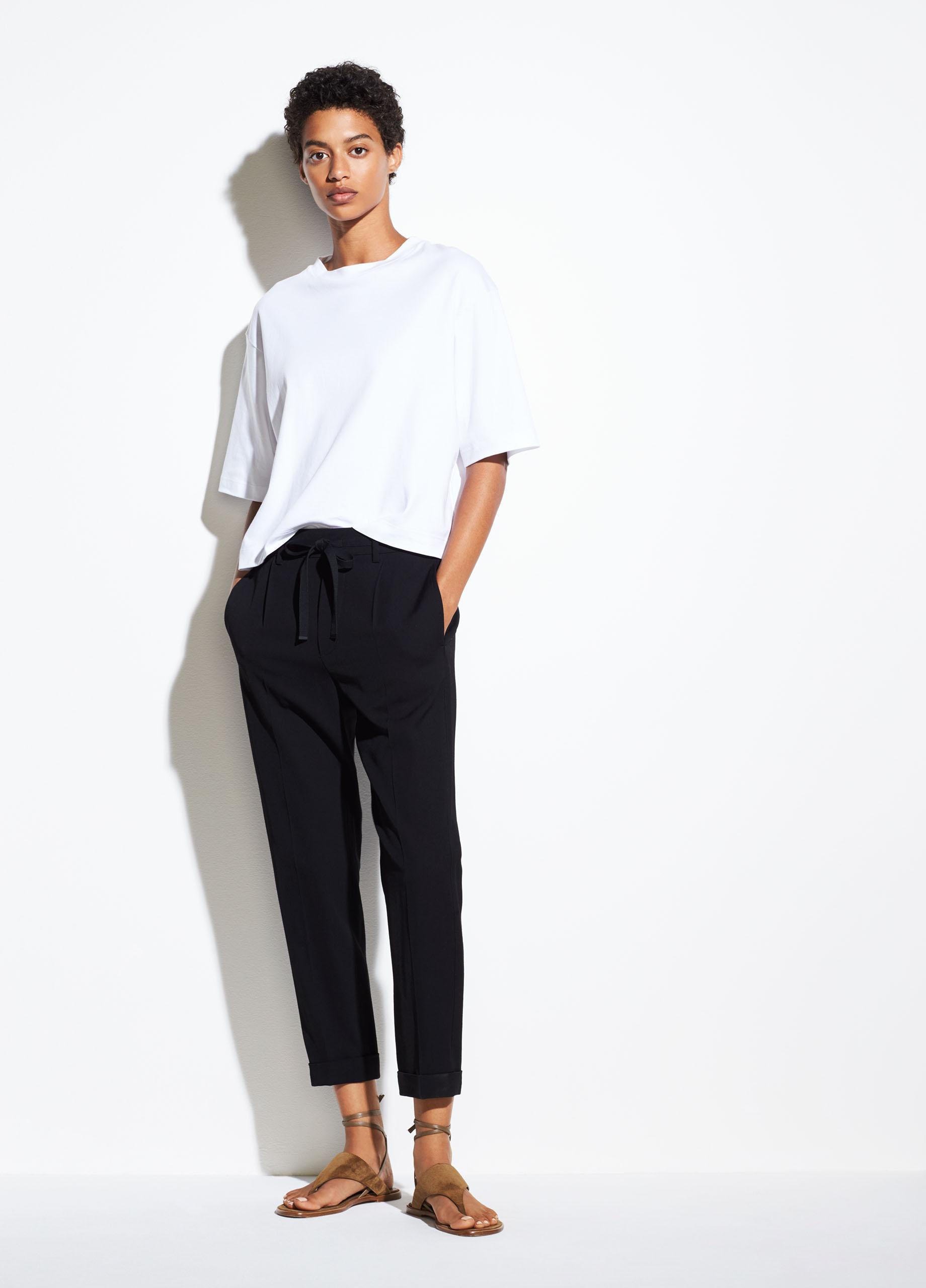The side strap jogger has been tailored from italian fabric. The tapered silhouette is emphasized by pressed creases and cuffed hems. Colour: black